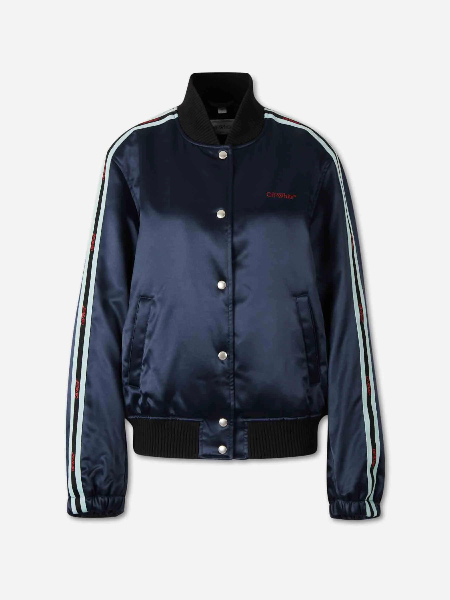 SKU: 772-001575 01 BRAND ID: 2EK00OS26FAB001 Bomber Jacket By Off-White • Bomber jacket • Made from acetate and viscose fabric • Bomber collar • Front button closure • Side pockets • Elasticated cuffs and ribbed hem • Composition: 58% acetate, 42% viscose • Made in: Italy