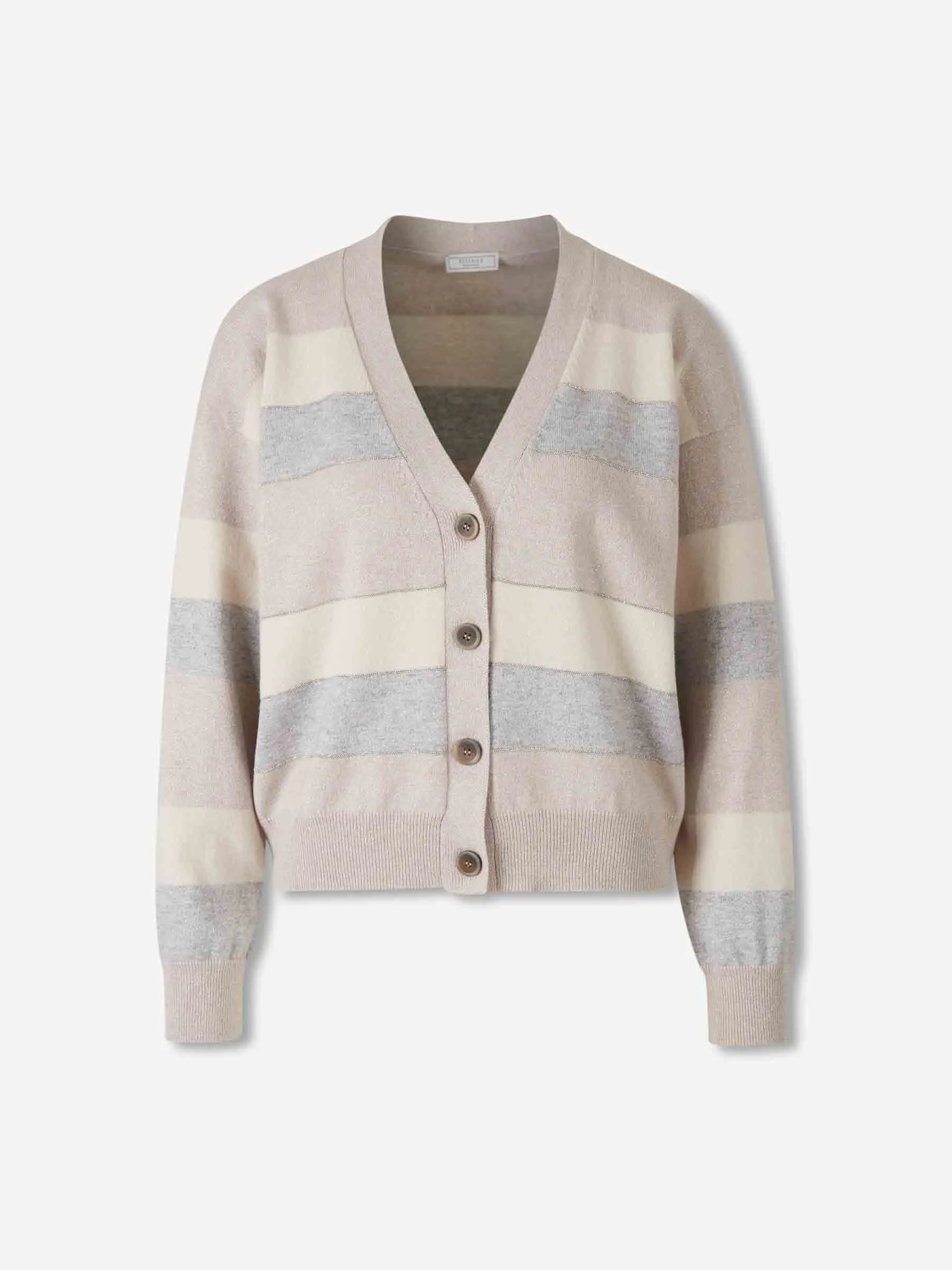 SKU: 713-000353 01 BRAND ID: A99368F129233B Cardigan by Peserico • Made with virgin wool, silk, cashmere and metallic fiber yarn • Rhinestone strip applications on the lists • V neck • Long sleeve • Button fastening Made in Italia 53% Virgin wool, 28% Silk, 13% Cashmere, 6% Metallic fiber