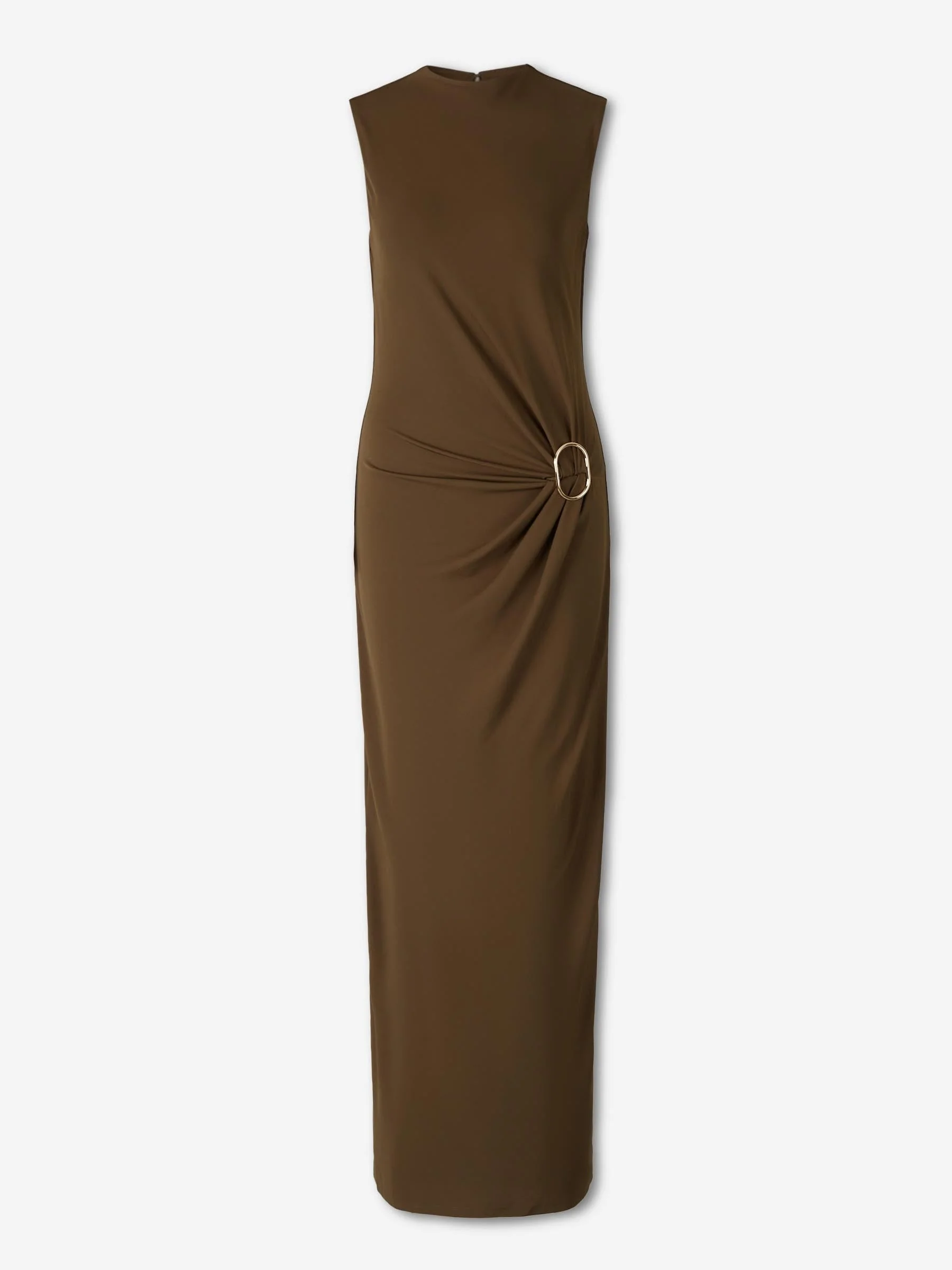 SKU: 732-001571 01 BRAND ID: RM-PF25-043X-JE-K Maxi Jersey Dress Maxi dress By Roland Mouret • Sleeveless • Fitted waist with round metallic piece detail and pleats • Round neckline • Fitted fit • Crafted from high-quality viscose jersey • Maxi dress • Invisible zipper closure at the back Composition: 94% Viscose, 6% Elastane Made in United Kingdom
