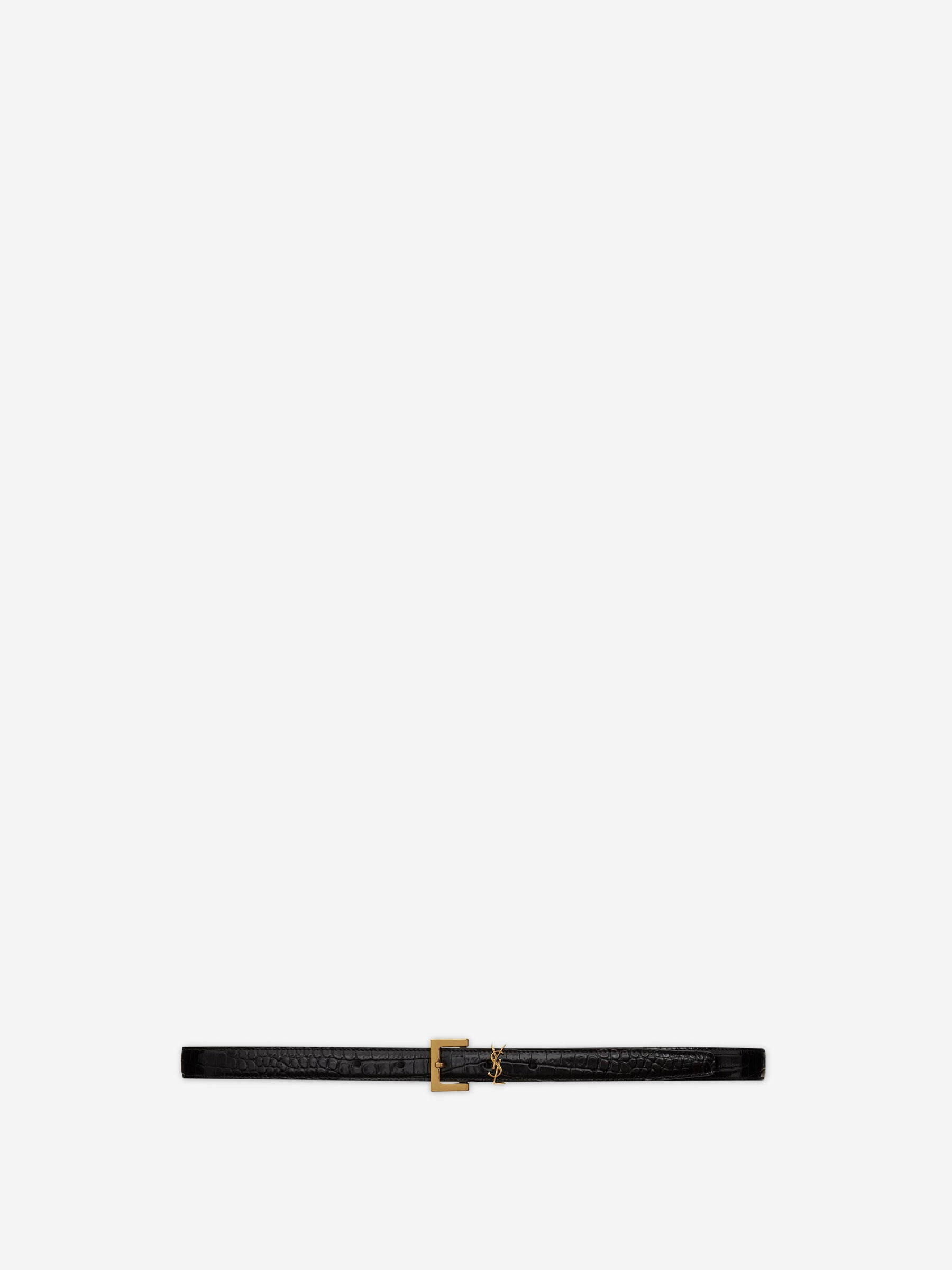SKU: 830-000402 01 BRAND ID: 554465DND0J Cassandre Leather Belt Belt By Saint Laurent • Monogram detail on the buckle • Discreet embroidered logo • Crafted with high-quality leather • Crocodile print • With square metal buckle Composition: 100% calfskin Made in: Italy
