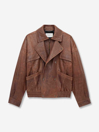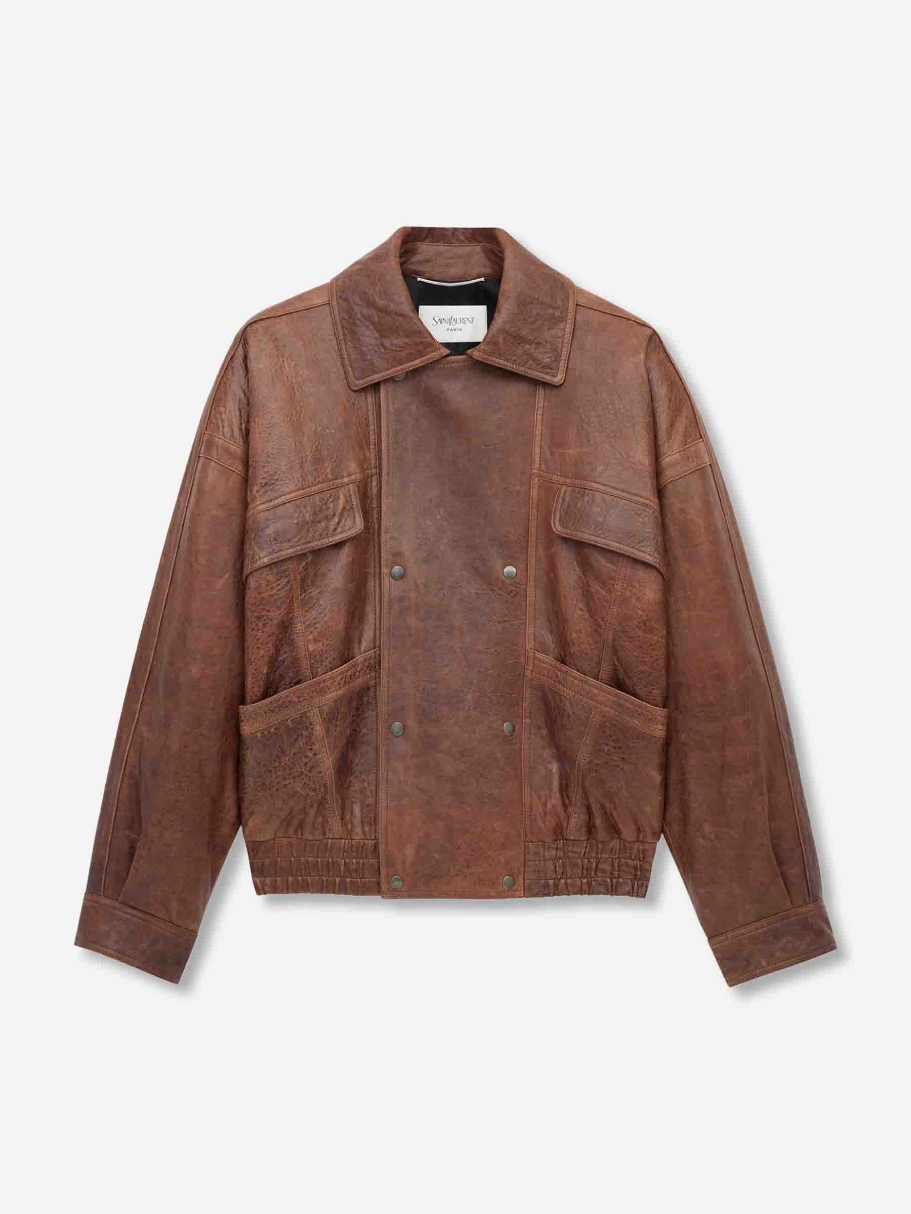 SKU: 511-000638 01 BRAND ID: 843931YCSX2 Crossed Leather Jacket Leather Jackets By Saint Laurent • Front patch pocket • Cuffs with adjustable button and gathered hem • Crafted from lambskin • Leather Jackets • Cross zip closure with snap button flap • Classic collar Composition: 100% leather Italy