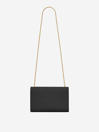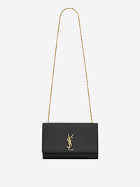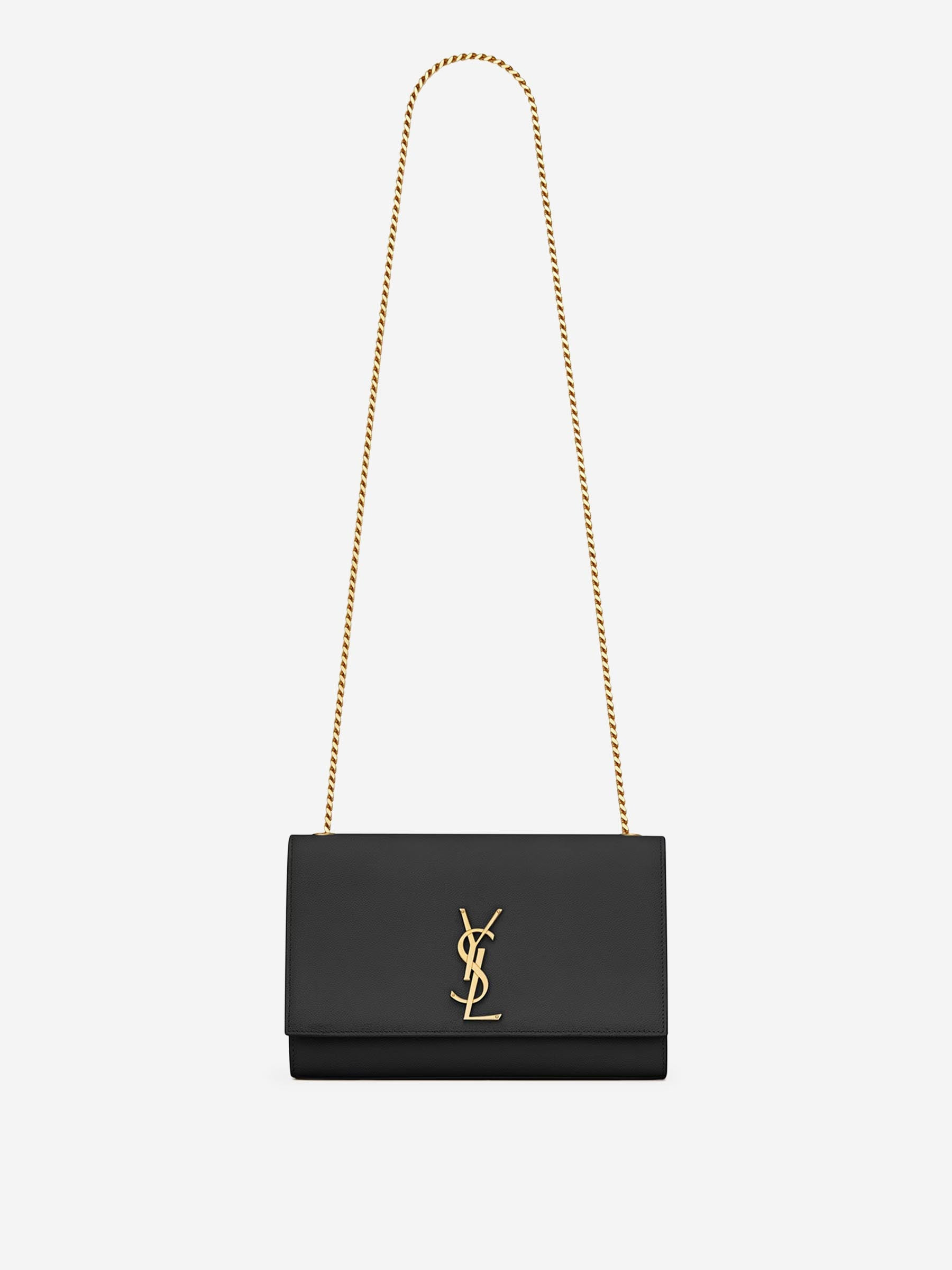 SKU: 810-008351 01 BRAND ID: 364021BOW0J Kate Medium Shoulder Bag Bag By Saint Laurent • One flat pocket inside • Fully lined interior • Saint Laurent embossed logo • Dimensions: 23.9 × 14.5 × 5.3 cm • Light bronze-colored brass pieces • Medium Size • Magnetic snap closure • Long gourmette chain shoulder strap • Crafted from calfskin with grain de poudre effect Composition: 100% calfskin Made in: Italy