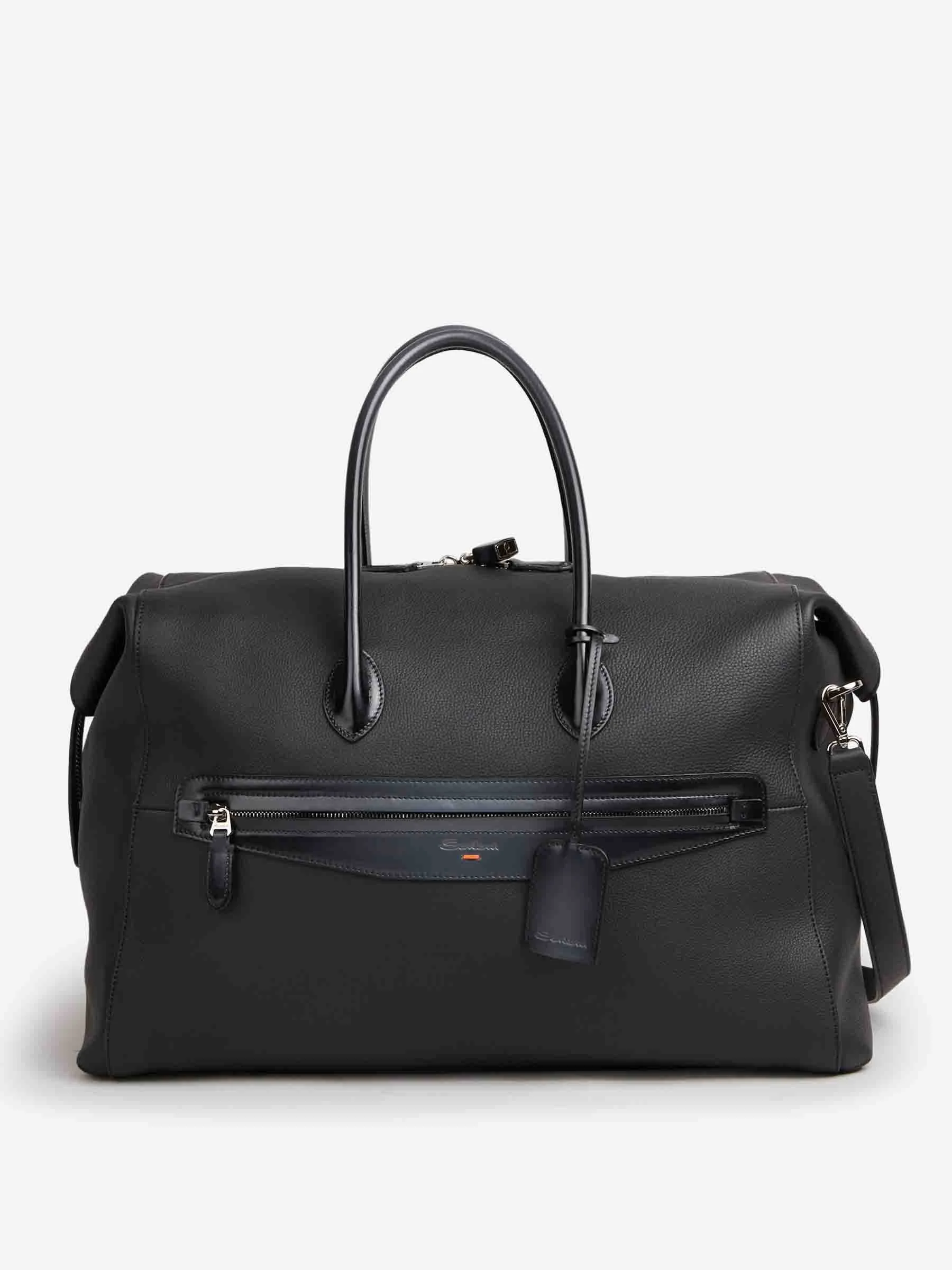 SKU: 692-002078 01 BRAND ID: UIBBA2646BS-ACSU travel bag By Santoni • Made from calfskin • Double zipper closure • Santoni logo print • Padded handles • Adjustable and removable shoulder strap • Internal zip pocket • Zip pocket on the front • Inner lining • Dimensions: 45.5cm x 28cm x 26cm • Composition: 100% calfskin • Made in: Italy