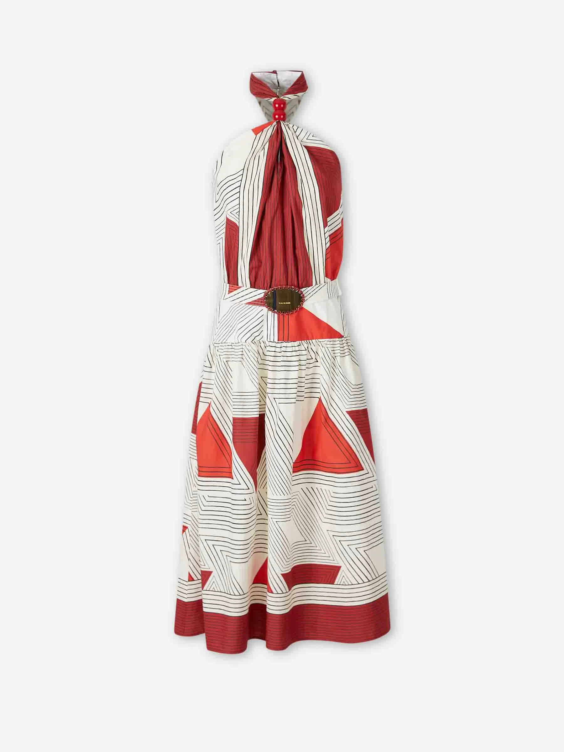 SKU: 732-001671 01 BRAND ID: ST260074 Vestido de Silvia Tcherassi • Vestido maxi • Estampado geometrico • Confeccionado en popelina de algodon • Escote halter con adorno • Falda acmapanada de cintura baja • Cierre de botones en el cuello • Cintura ajustada con cinturon a juego • Composicion: 100% algodon • Hecho en: Colombia