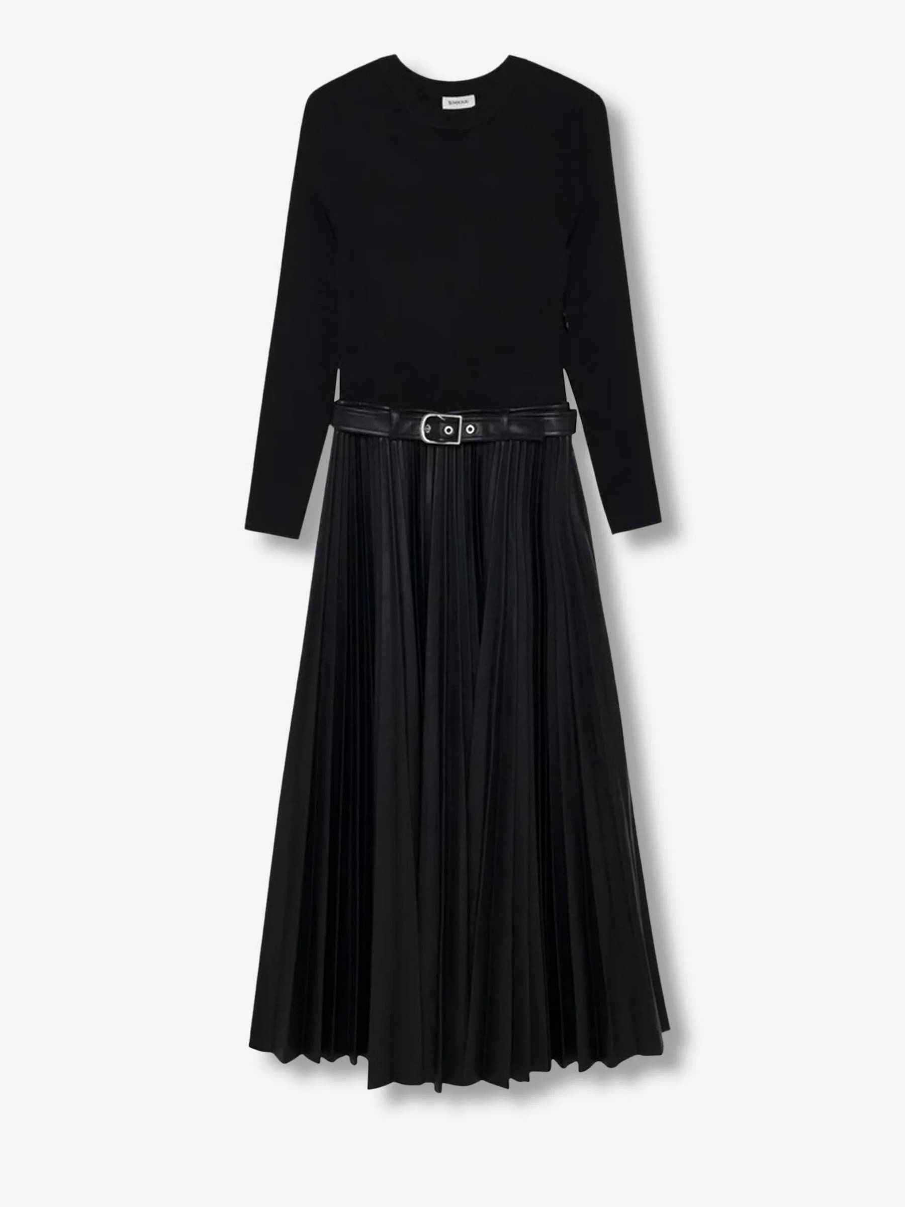 SKU: 721-000714 01 BRAND ID: 525-1019-K Dress By Simkhai • High waist • Belt detail • Fitted • Made in knit fabric and leather with micro-pleats • Side zip closure • Round neck and long sleeve • Composition: 100% polyester • Made in: Italy