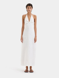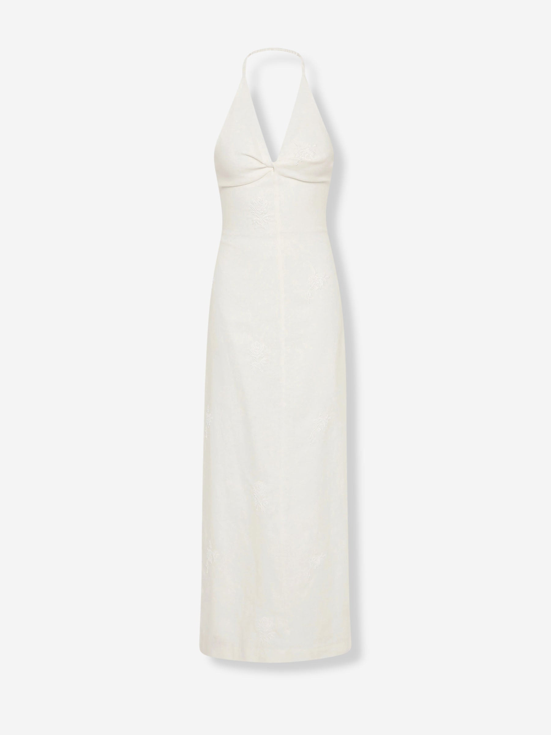 Alessandra twist-front embroidered linen halterneck midi dress White