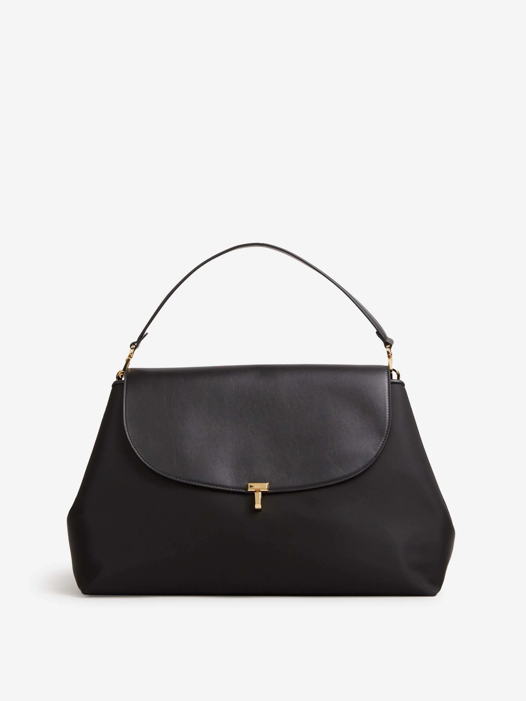 SKU: 814-000029 01 BRAND ID: 254-WAL0096-FB0182 Leather T-Lock Bag Bag By TOTEME • 40 x 26 x 14 cm • An interior compartment with two sliding inner pockets • Microfiber lining • Made of smooth calfskin • Removable and adjustable strap and removable top handle • Metal rotary closure in gold tone 100% calfskin Italy