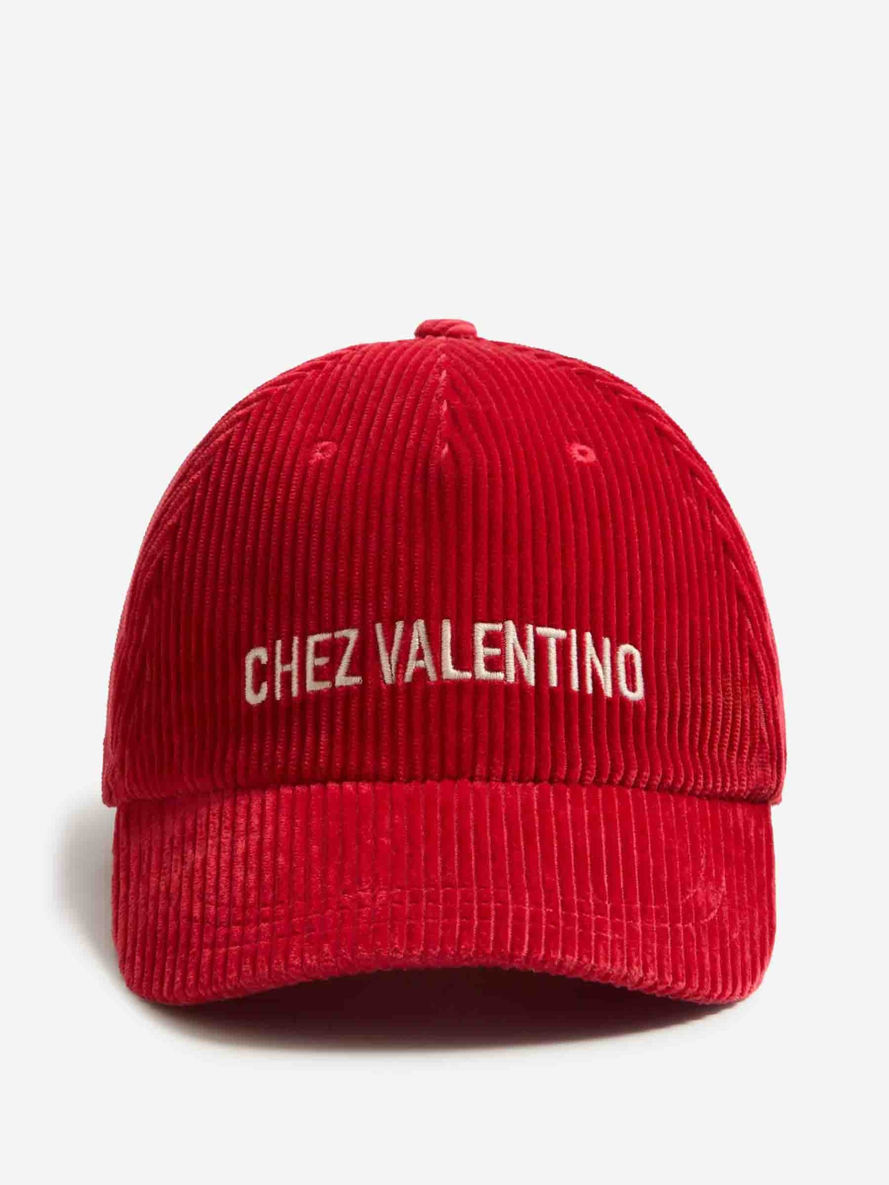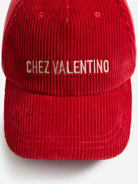 SKU: 695-001815 01 BRAND ID: 7Y2HDA41TQJ Cap by Valentino Garavani • Baseball cap • Made of velvet • Chez Valentino embroidered logo • Adjustable with buckle Made in Italia 100% Cotton