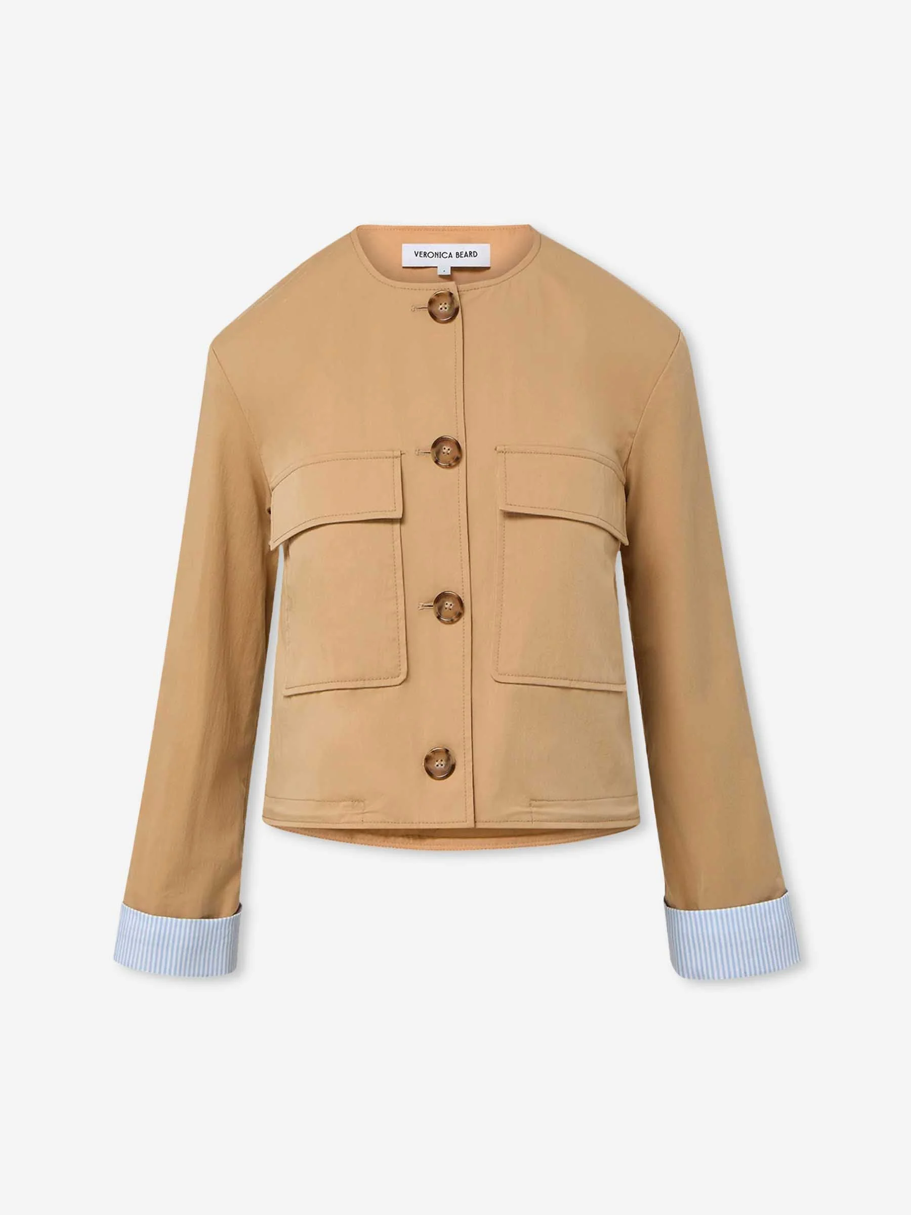 SKU: 741-002334 01 BRAND ID: 2603SU03611952 's Jacket By Veronica Beard • Regular fit • Made from a blend of cotton, polyamide and elastane • Central button panel on the front • Patch pockets with flaps on the front • Adjustable hem with inner elastic band • Cuffs with striped print fabric • Composition: 68% cotton, 27% polyamide, 5% elastane • Made in: USA
