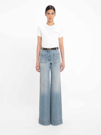 SKU: 763-001649 01 BRAND ID: 1125DJE005218M Jeans by Victoria Beckham • High waist and flared legs • Made of cotton denim • Embroidered logo on the front pocket • Front patch pockets • Back patch pockets • Zip and button fastening • Tobacco stitching details Leather logo patch on waistband Made in Italia Leg length: 118 cm100% Cotton