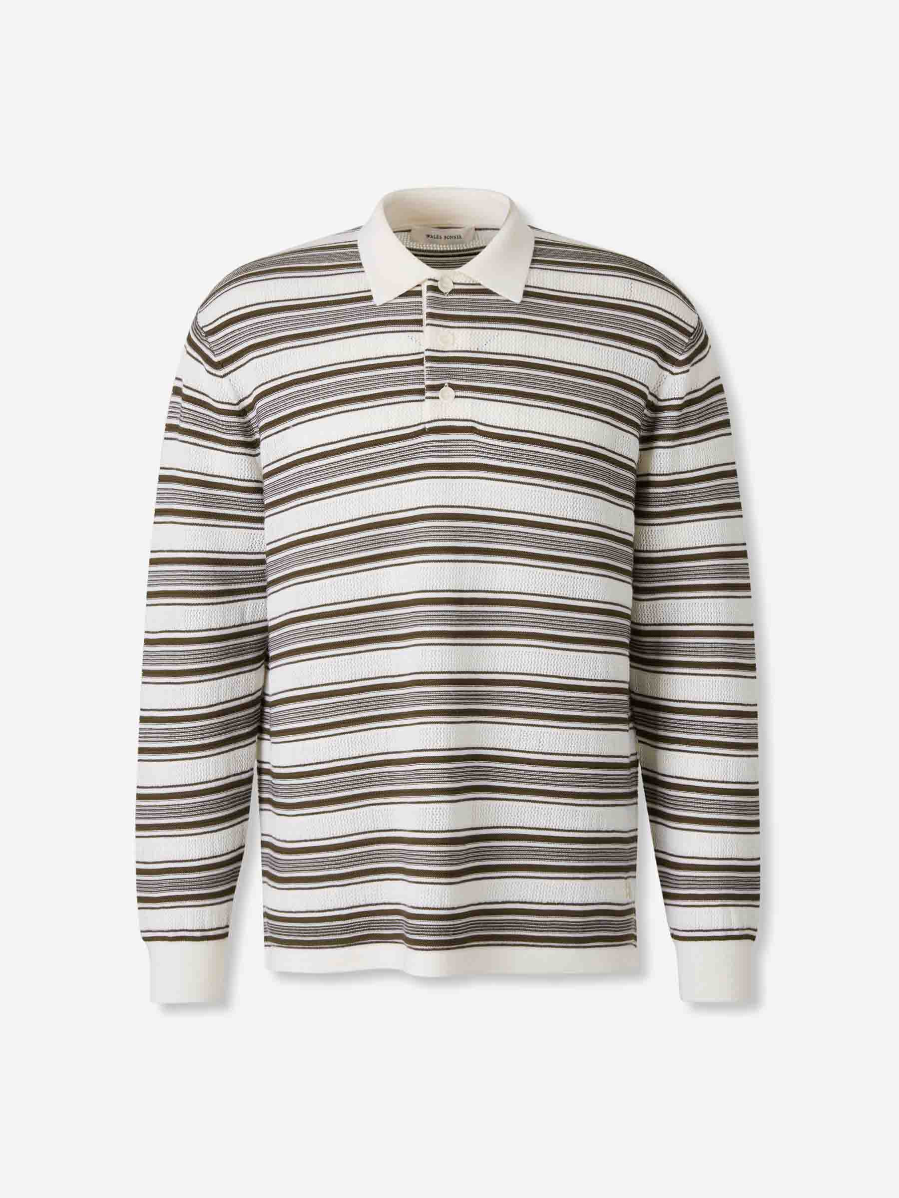 SKU: 551-000394 01 BRAND ID: MA25KN39-WO08 Knit Wool Polo Polo By Wales Bonner • Ribbed finishes at cuffs and hem • Regular fit • Listed pattern • Crafted from a blend of wool, viscose, and nylon • Long Sleeve Polo • Polo collar with buttons Composition: 65% wool, 23% viscose, 12% nylon China