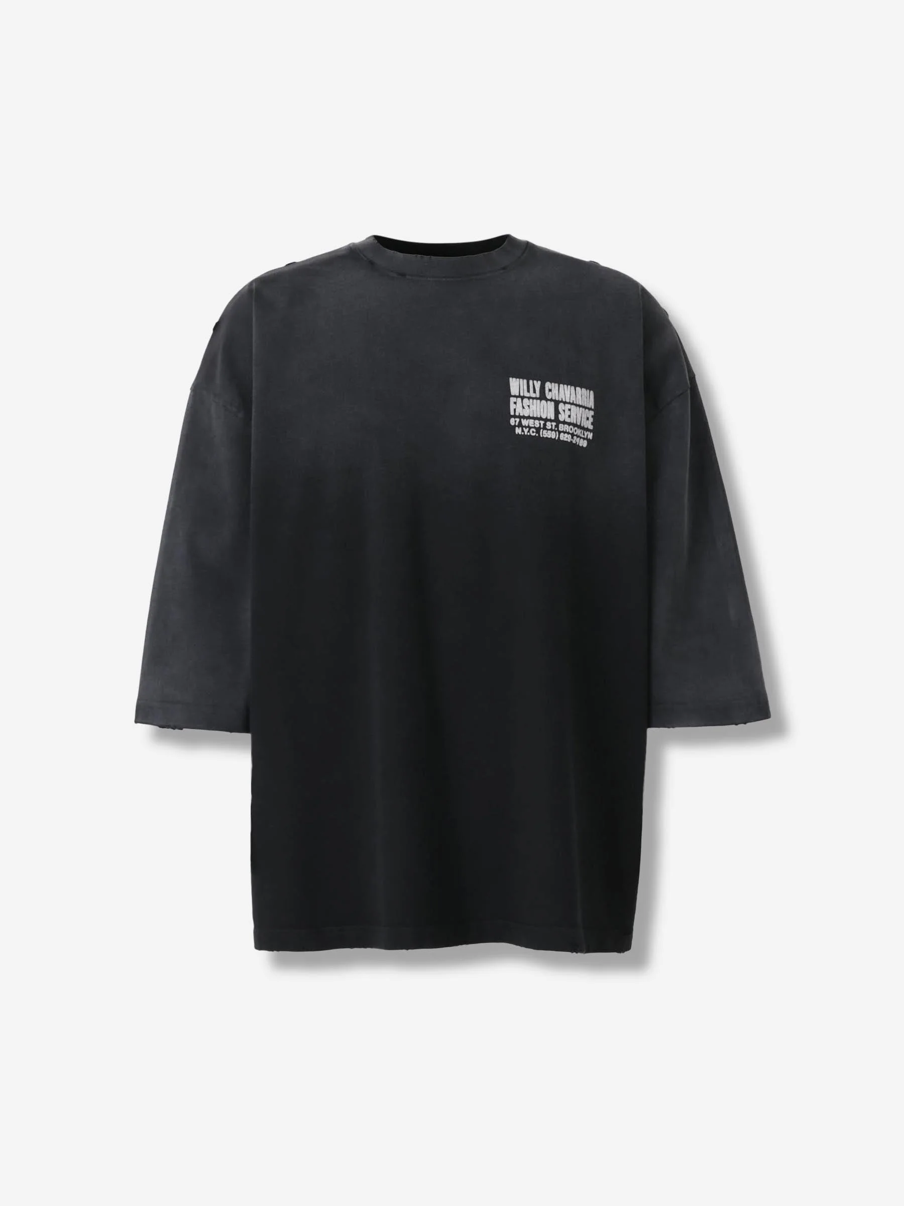 SKU: 553-004454 01 BRAND ID: WCJSY0110 Oversize Printed T-shirt T-shirt By Willy Chavarria • Ribbed finishes at the neck • Oversize fit • Printed on front and back • Worn finish • Made in cotton jersey • 3/4 Sleeve T-shirt • Round neck Composition: 100% cotton United States