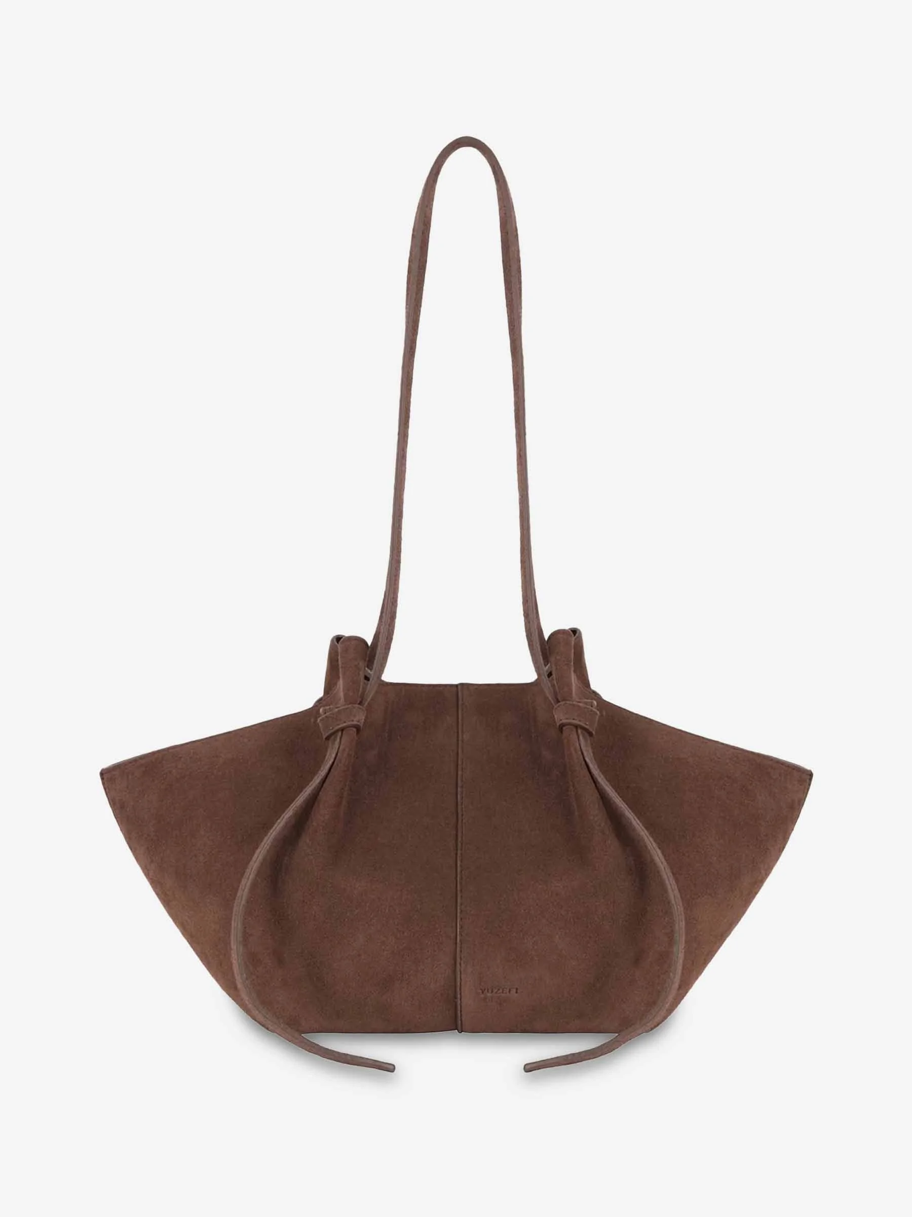 SKU: 812-000062 01 BRAND ID: MOCHI SUEDE Bag By Yuzefi • 40.5 x 19.5 x 13 cm • Lined interior and distinctive organic curves, folds and knots • Hardware in gold tone • Made of bovine suede • Adjustable strap • Magnetic closure • 100% suede • Made in: Spain