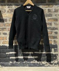 Featured in deep black. From AD 2011. Collaboration garment between CDG and Charles Kirk, made in England. Plush fabric that hugs the body. High v-neck collar with tonal micro-ribbed cuffing on the collar, hem, and hand cuffs. Tonal “CDG” emblem on the left chest. Very good condition. No notable flaws including stains, tears, smells, holes, etc. Some natural feeling of wear from age. Tagged size small. Fits approximately true. Measurements available upon request. Feel free to message me with any questions, comments, or offers. Shipping included to the Continental U.S. International buyers please contact for a quote
