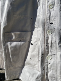 Featured in pure white. Thigh length jacket constructed of a mid-to-heavy weight cotton canvas. Sturdy and resilient, with vertical tonal stripe detailing in the material. Tonal buttons and “Striking Images” embroidery on the chest. Contrasting paint splatter on the bottom front. 4 total pockets; 3 external, 1 internal. Outstanding condition. Essentially kept new since original purchase. All original accessories, including hanger and tags, are included. Tagged size medium. Fits approximately true to size. Measurements available upon request. Feel free to message me with any questions, concerns or offers. Shipping included to the Continental U.S International buyers please contact for a quote