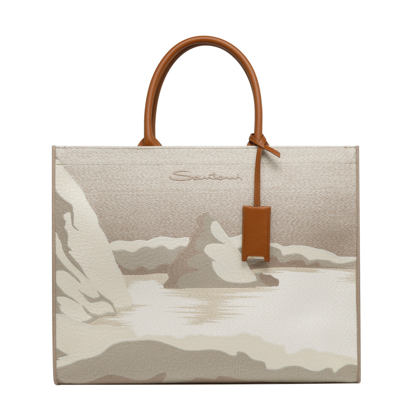 Like a precious souvenir, a postcard from the most charming places in Le Marche, this shopper is a homage to Santoni's homeland, and to its artistic and artisanal heritage. Its fabric construction is embellished with an entirely hand-embroidered design depicting the stunning cliffs of Portonovo. Elevated with leather details, a mini mirror charm and a handy inside zip pocket. Product details Product ID: DIBBA2457BAH2RME15 - Shopper - Crafted from hand-embroidered fabric - Souvenir intarsia design - Colour: white and beige - Tan leather handles and details - Detachable charm with mirror - Inside zip pocket - Tonal embroidered Santoni logo - Dimensions: 44 cm x 35 cm x 17 cm - Made in Italy
