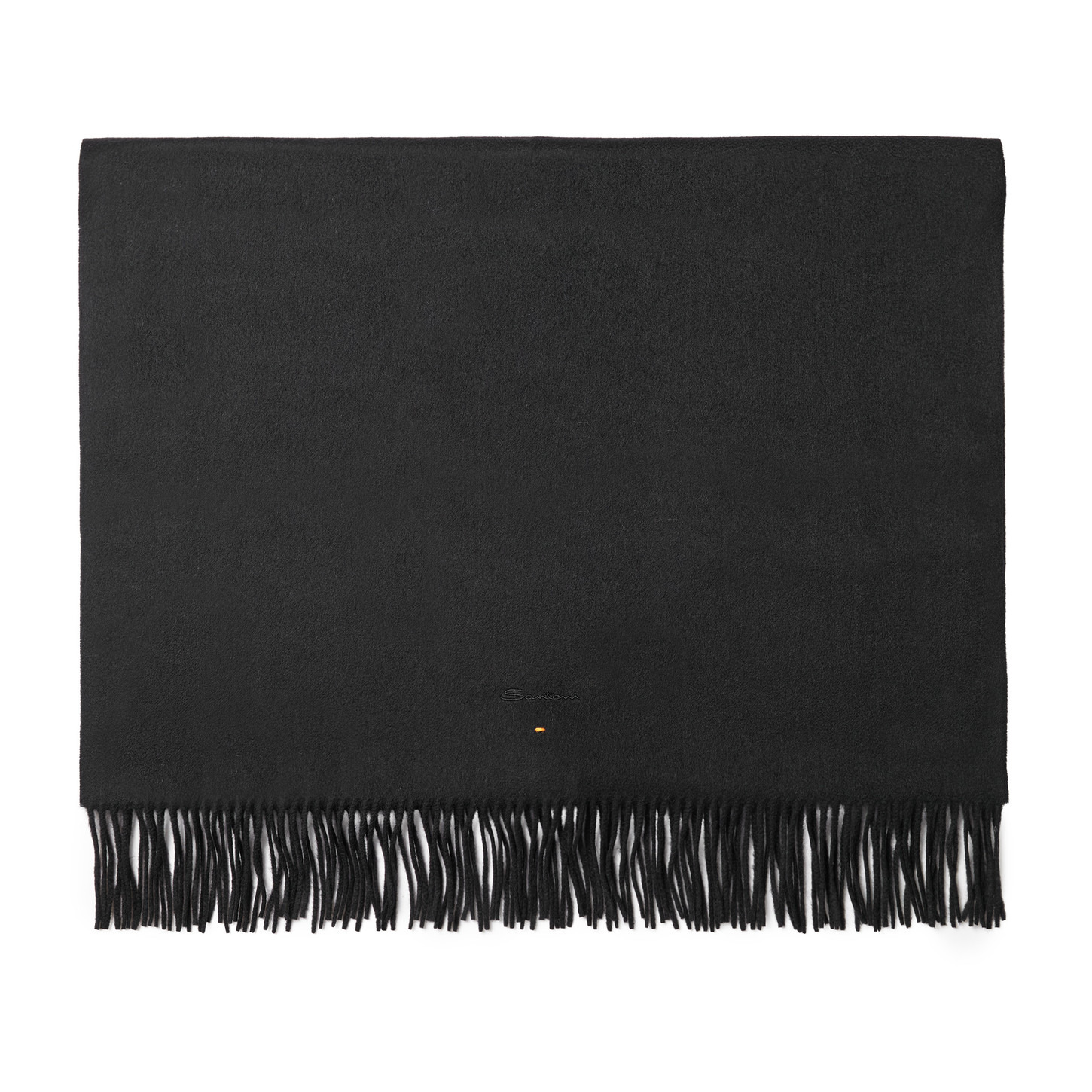 Iconic details, soft yarn and modern proportions: this women’s scarf is a true style statement. It is crafted in Italy from pure combed cashmere: lightweight, finely spun and woven for exceptional quality. Finished with delicate fringe on the ends and Sigillo topstitching in Arancio Santoni, it reflects the Maison’s devotion to artisanal excellence down to the smallest detail. Product details Product ID: AWFLC0036XXXLCFN01 - Crafted from cashmere - Color: black - Embroidered Santoni logo - Hand-sewn signature Sigillo topstitching in Arancio Santoni thread - Finished with fringe trims on the short sides - Dimensions: 70 cm x 206 cm - Made in Italy