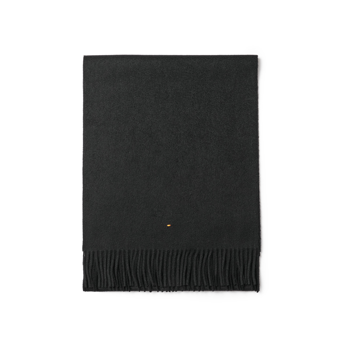 Iconic details, soft yarn and modern proportions: this men’s scarf is a true style statement. Crafted from premium cashmere, it offers a soft touch and enveloping warmth for the coldest days. Finished with delicate fringed edges and Sigillo topstitching in Arancio Santoni, it reflects the Maison’s devotion to artisanal excellence down to the smallest detail. Product details Product ID: AMFLC0033XXXLCFN01 - Crafted from cashmere - Color: black - Embroidered Santoni logo - Hand-sewn signature Sigillo topstitching in Arancio Santoni thread - Fringe trims - Dimensions: 35 cm x 196 cm - Made in Italy