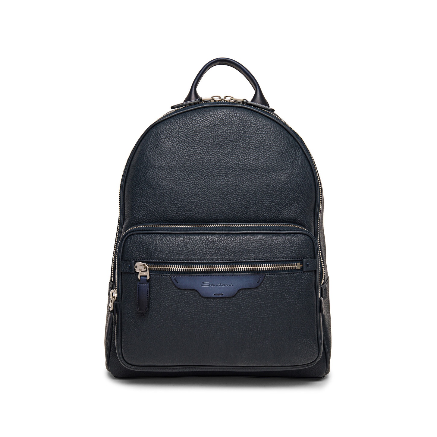 Dynamic and sophisticated, the Santoni men's backpack is perfect for running city errands and informal work events alike. Crafted from tumbled leather, it boasts a whole host of inside and outside pockets to keep your belongings tidy and organised. Product details Product ID: UIBBA2364ENA2IBU60 - Men’s backpack - Crafted from tumbled leather - Leather details treated with Santoni’s “velatura” colour-grading technique - Colour: blue - Two inside compartments - Front zip pocket - Adjustable straps - Two-way zip closure - Tonal debossed Santoni logo - Dimensions: 45 cm x 35 cm x 19 cm