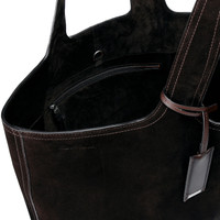 Combining oversized volumes with a soft, deconstructed design, this shopper is an essential for refined city looks. Its supple suede leather design is elevated with a contrast orange base and delicate stitching: a flash of signature Santoni orange and an ode to our iconic style codes. Complete with a handy mirror charm and inside zip pocket for effortless ease and functionality. Product details Product ID: DIBBA2555BAFJNOT50 - Shopper - style - Crafted from suede - Color: dark brown - Top handles - Detachable charm with mirror - Inside zip pocket - Debossed Santoni logo - Dimensions: 41 cm x 36 cm x 20 cm - Made in Italy