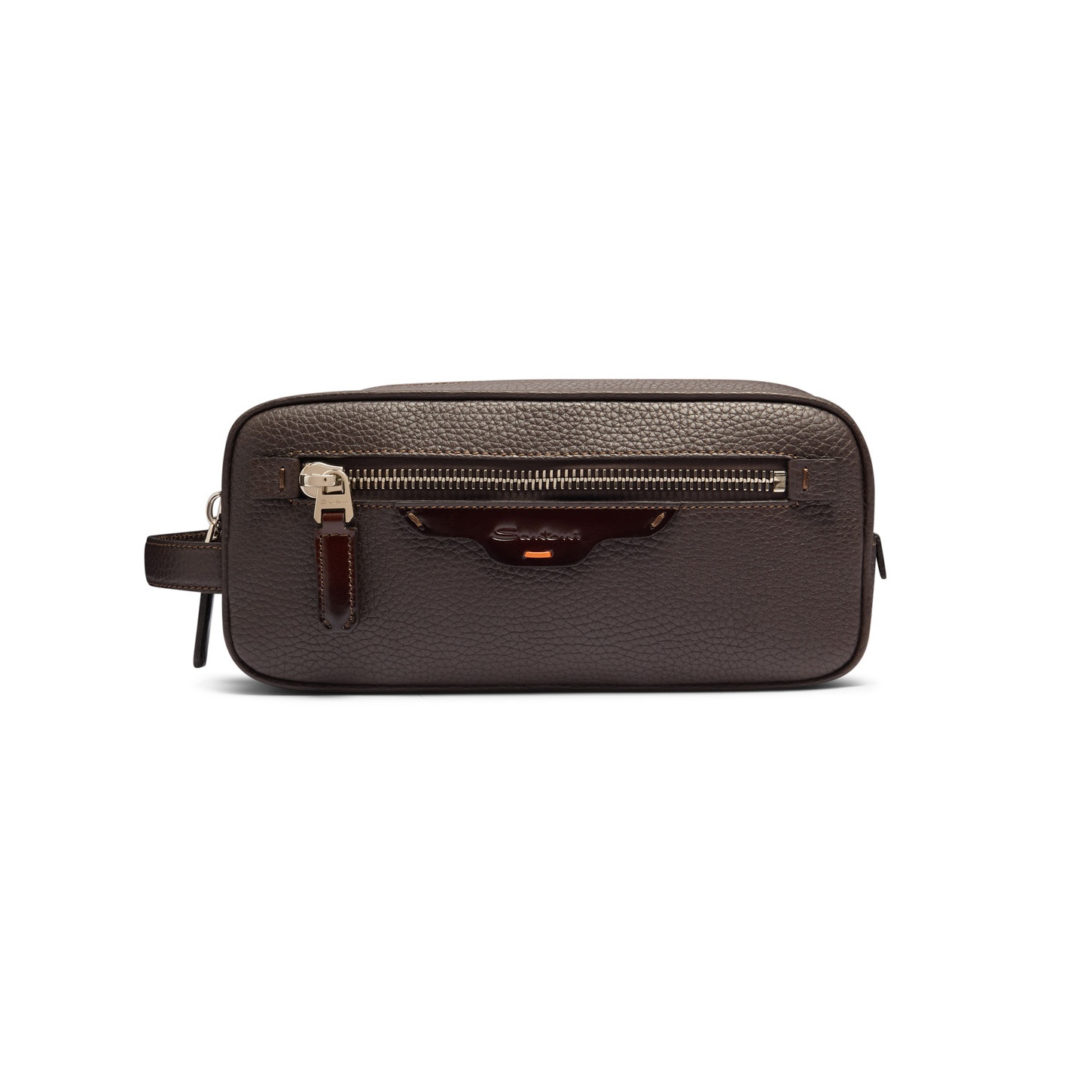 An elegant travel essential, this Santoni wash bag is crafted from a refined combination of tumbled and smooth leather, with the latter showcasing the Maison’s signature “velatura” finish. Two inside pockets and another zip one on the front make it easy to keep all your cosmetics organised. Complete with a side handle so you can hang it up too. Product details Product ID: UFPPA2772FOAITBT50 - Crafted from tumbled leather - Leather details with “velatura” gradated finish - Color: dark brown - Top handle - Two zip compartments - Front zip pocket - Debossed Santoni logo - Arancio Santoni leather stitch - Made in Le Marche, Italy