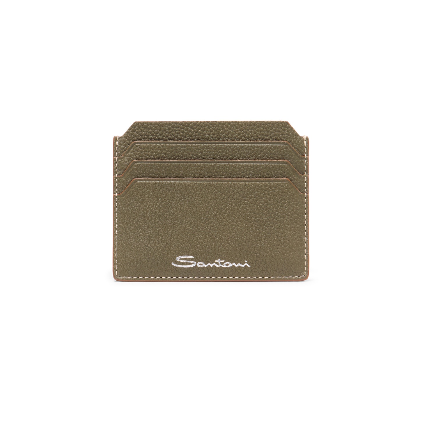 Fine tumbled leather and a sleek design for everyday functionality. This cardholder features a central pocket and three bevelled-edge slots on each side. Embellished with an embossed Santoni logo on the front for a signature touch. Product details Product ID: UFPPA2693FOASIWV51 - Crafted from tumbled leather - Color: green - Central pocket - 3 card slots per side - Embossed Santoni logo on the front - Made in Le Marche, Italy