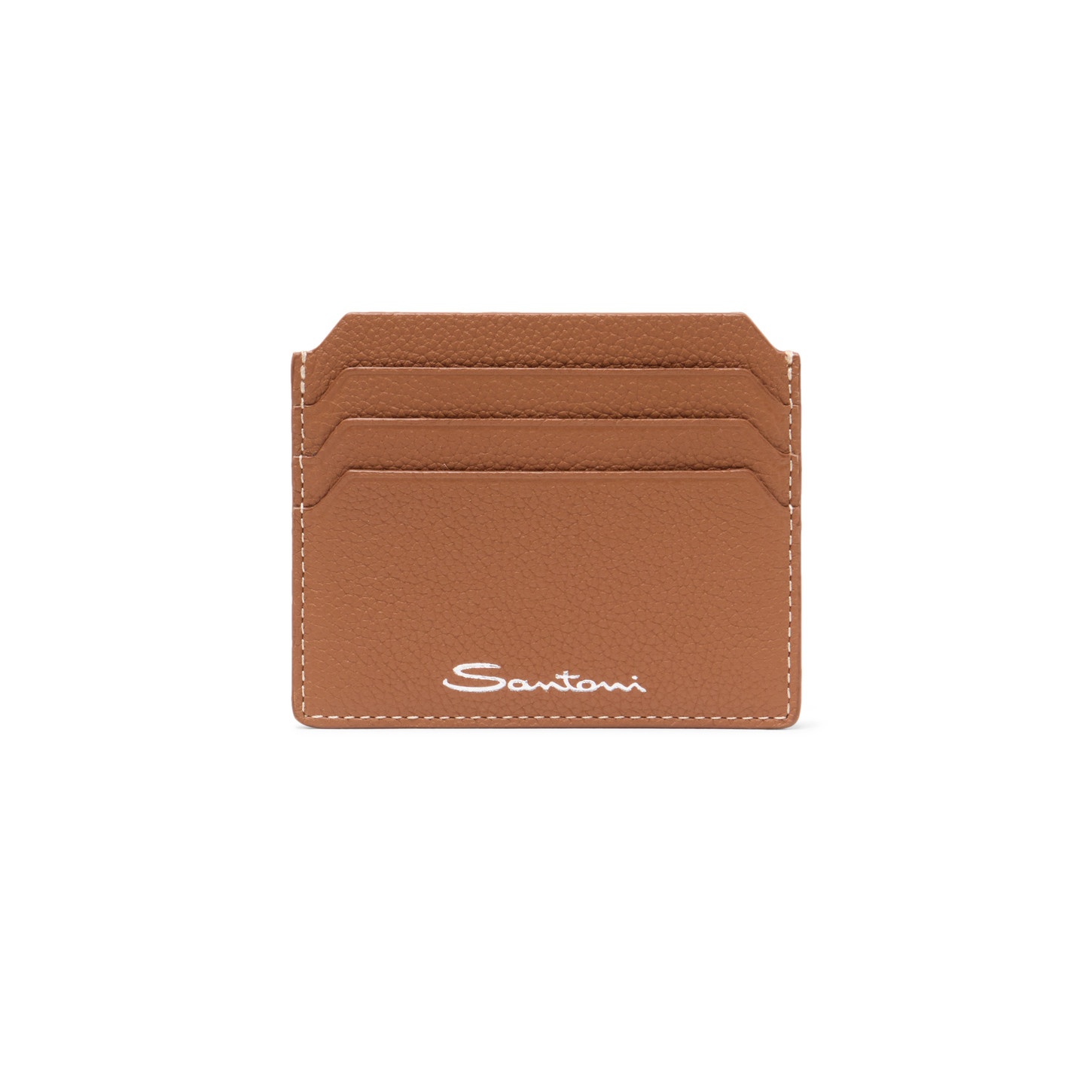 Fine tumbled leather and a sleek design for everyday functionality. This cardholder features a central pocket and three bevelled-edge slots on each side. Embellished with an embossed Santoni logo on the front for a signature touch. Product details Product ID: UFPPA2693FOASIWM40 - Crafted from tumbled leather - Color: light brown - Central pocket - 3 card slots per side - Embossed Santoni logo on the front - Made in Le Marche, Italy