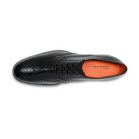 This Derby lace-up from the Santoni Easy collection combines classic elegance with artisanal innovation. Crafted with iconic brogue detailing, this style is distinguished by a flexible, ultra-light silhouette that weighs just 295g. Its fine leather construction is elevated with a perforated nappa lining, a memory foam insole and a rubber sole with unique Doubling design: a decorative pattern inspired by Santoni’s signature Double Buckle detail that simultaneously ensures optimal grip and durability. Complete with hidden elastic integrated into the upper for even greater comfort. Product details Product ID: MGEO19033NEAXNTGN01 - Santoni Easy collection with ultra-lightweight construction - Crafted from leather - Color: black - Brogue detailing - Five-hole lace-up fastening with hidden elastic - Classic silhouette with round toe - Perforated nappa lining - Memory foam insole - Orange rubber sole with double-buckle pattern - Printed Santoni logo on the insole - Made in Le Marche, Italy