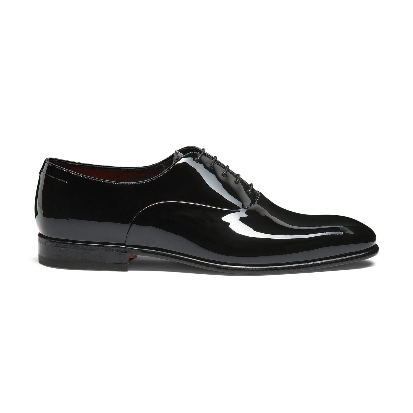 An evening essential for exclusive occasions, this Oxford lace-up exudes the distinctive charm of formal elegance in every detail. Reinterpreting a timeless icon through a contemporary lens, it’s crafted from shiny patent leather and finished with a contrast sole, marking each stride with the radiant allure of Arancio Santoni orange. Product details Product ID: MCAD18908BC3MVERN01 - Crafted from patent leather - Color: black - Classic tapered silhouette - Five-hole lace-up fastening - Leather sole with half rubber heel - Printed Santoni logo on the insole - Made in Le Marche, Italy