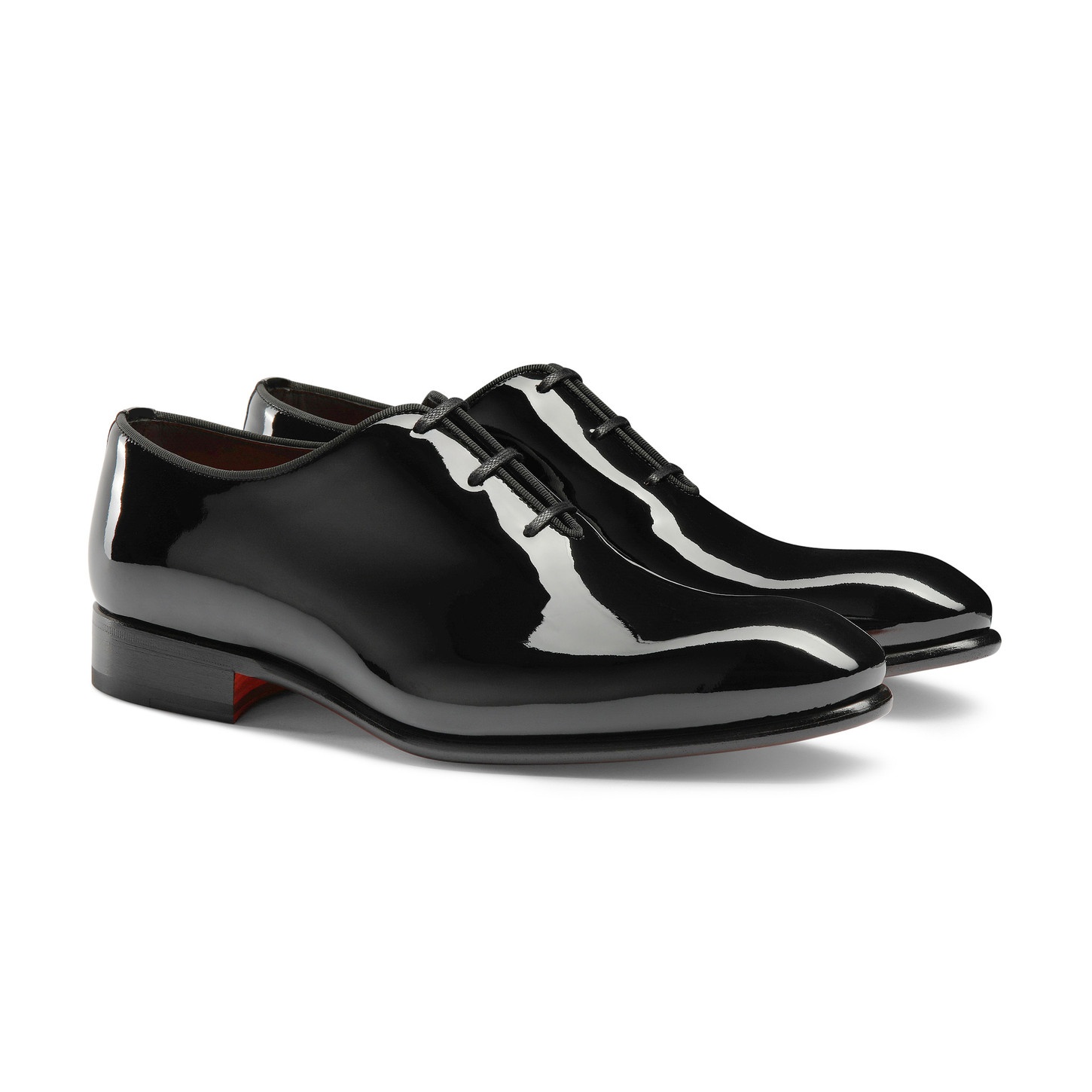 This Oxford lace-up exudes an exclusive allure, specially designed to add an extra-special touch to more formal outfits. Created entirely by hand, it flaunts a sleek, lightweight upper crafted from patent leather, constructed with stitching only on the heel. Grosgrain trims and laces elevate its otherwise its classic tapered silhouette. Product details Product ID: MCCR16229BC3JVERN01 - Men’s Oxford shoe - Crafted from patent leather - Colour: black - Classic tapered silhouette - Three-hole grosgrain lace-up fastening - Grosgrain trims - Lightly padded and quilted satin lining - Leather sole - Printed Santoni logo on the insole - Made in Italy