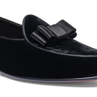A reinterpretation of an archival classic, the Andrea loafer is a seamless fusion of formal allure and lightweight modern comfort. This iteration presents the sleek, low-cut silhouette in soft velvet, bringing refined personality to evening ensembles and special occasions. Styled with apron stitching and a sophisticated satin bow. Product details Product ID: MCAN19149LA1FSBWN01 - Crafted from velvet - Color: black - Satin bow - Apron stitching - Classic silhouette with tapered toe - Leather sole with half rubber heel - Printed Santoni logo on the insole - Made in Le Marche, Italy