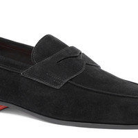 Elevate your everyday wardrobe with this suede loafer, adding a refined update to office-to-evening looks. This style flaunts an elegant silhouette with a classic saddle strap and raised apron stitching to accentuate its timeless lines. A contrast orange sole marks every stride with signature Santoni allure, whilst its Goodyear welt construction makes for a soft, flexible feel. Product details Product ID: MCNC18837SA4SEAAN01 - Men's loafer - Crafted from suede - Colour: black - Raised apron stitching - Classic tapered silhouette - Goodyear welt construction - Leather sole with half rubber heel - Printed Santoni logo on the insole - Made in Italy