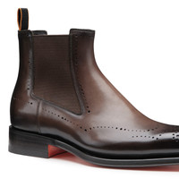 Combining classic elegance with modern allure, this Chelsea boot is an emblem of Santoni’s contemporary craftsmanship. Its fine leather construction showcases the radiant allure of our signature “velatura” gradated finish. Quintessential brogue detailing is reinterpreted through a modern lens to bring a sophisticated touch to its otherwise classic design, while a Goodyear welt construction ensures optimal resistance. Product details Product ID: MCCR19108MC8HIOTE81 - Crafted from leather - Treated with Santoni’s “velatura” color-grading technique - Color: brown - Brogue detailing - Classic tapered silhouette - Elasticated side inserts - Logo tape pull tab - Goodyear welt construction - Leather sole with half rubber heel - Printed Santoni logo on the insole - Made in Le Marche, Italy