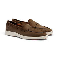 With its sophisticated yet lightweight silhouette, this penny loafer brings a refined touch to any outfit, crafted from subtly textured suede in line with Santoni's enduring vocation for beauty and quality. Styled with a wide fit and rubber sole for ultimate morning-to-night comfort. Product details Product ID: MGDT19051TICSEAAM21 - Crafted from suede - Color: brown - Saddle strap - Apron stitching with polished finish - Classic silhouette with round toe - Unlined - Smooth rubber sole - Arancio Santoni orange tread - Printed Santoni logo on the insole - Made in Le Marche, Italy