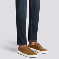 This slip-on sneaker is crafted from ultra-touch leather, distinguished by an impeccably soft and supple glove-like feel. Several refined details pay tribute to Santoni's enduring legacy, such as a side logo print and a contrast graphic on the tread that reimagines our iconic double-buckle detail. A flexible rubber cupsole completes the design for impeccable comfort from morning to night. Product details Product ID: MBCD21995BARTMVIC51 - Crafted from ultra-touch leather - Color: brown - Pull tab - Round toe - Unlined - Rubber cupsole - Arancio Santoni orange double-buckle detail on the tread - Made in Le Marche, Italy