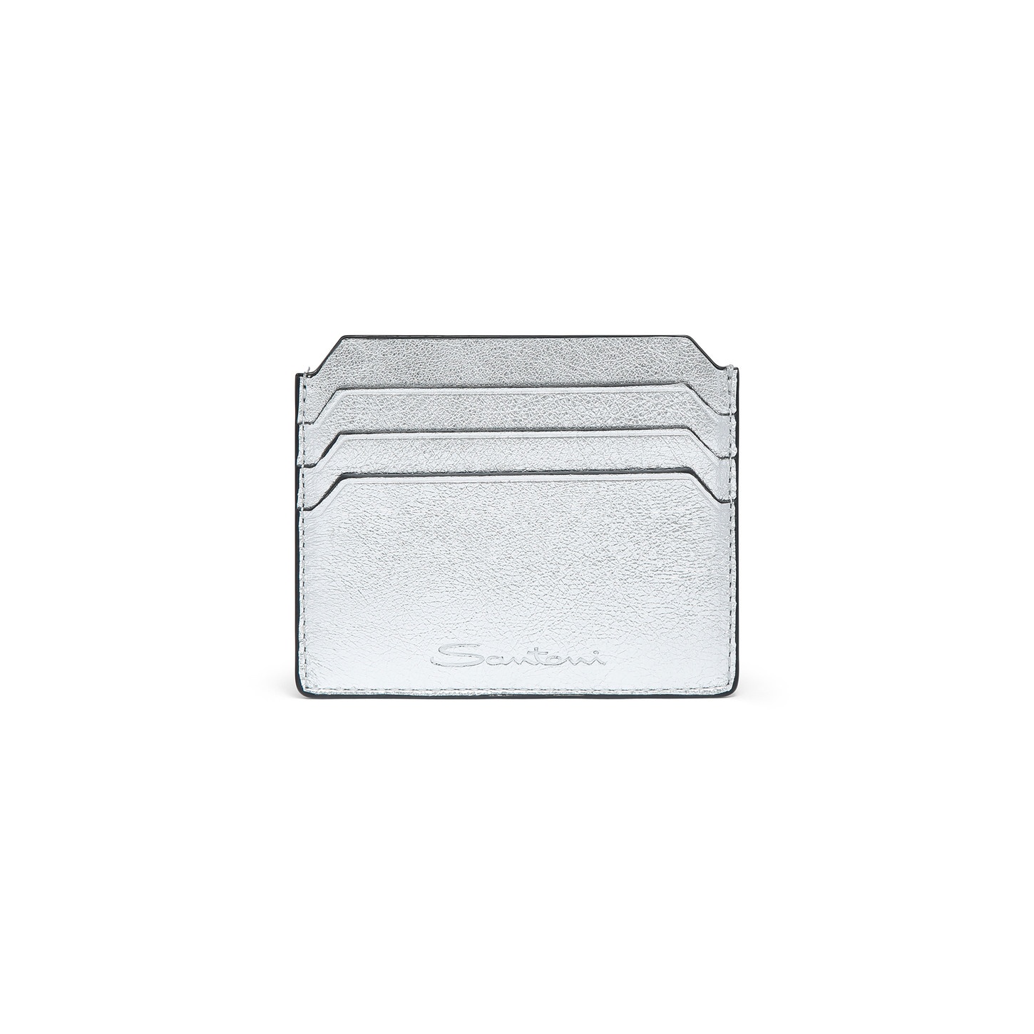 Beauty is found in the smallest of details. Crafted with meticulous care, this Santoni cardholder is made from metallic leather for a stand-out look. Its rectangular silhouette features a central pocket and three slots on each side. Product details Product ID: DFPPA2693FOHLPGD50 - Made from metallic leather - Colour: silver - Central pocket - 3 card slots per side - Embossed Santoni logo on the front - Dimensions: 10cm x 8,5cm x 0,5cm - Made in Le Marche, Italy