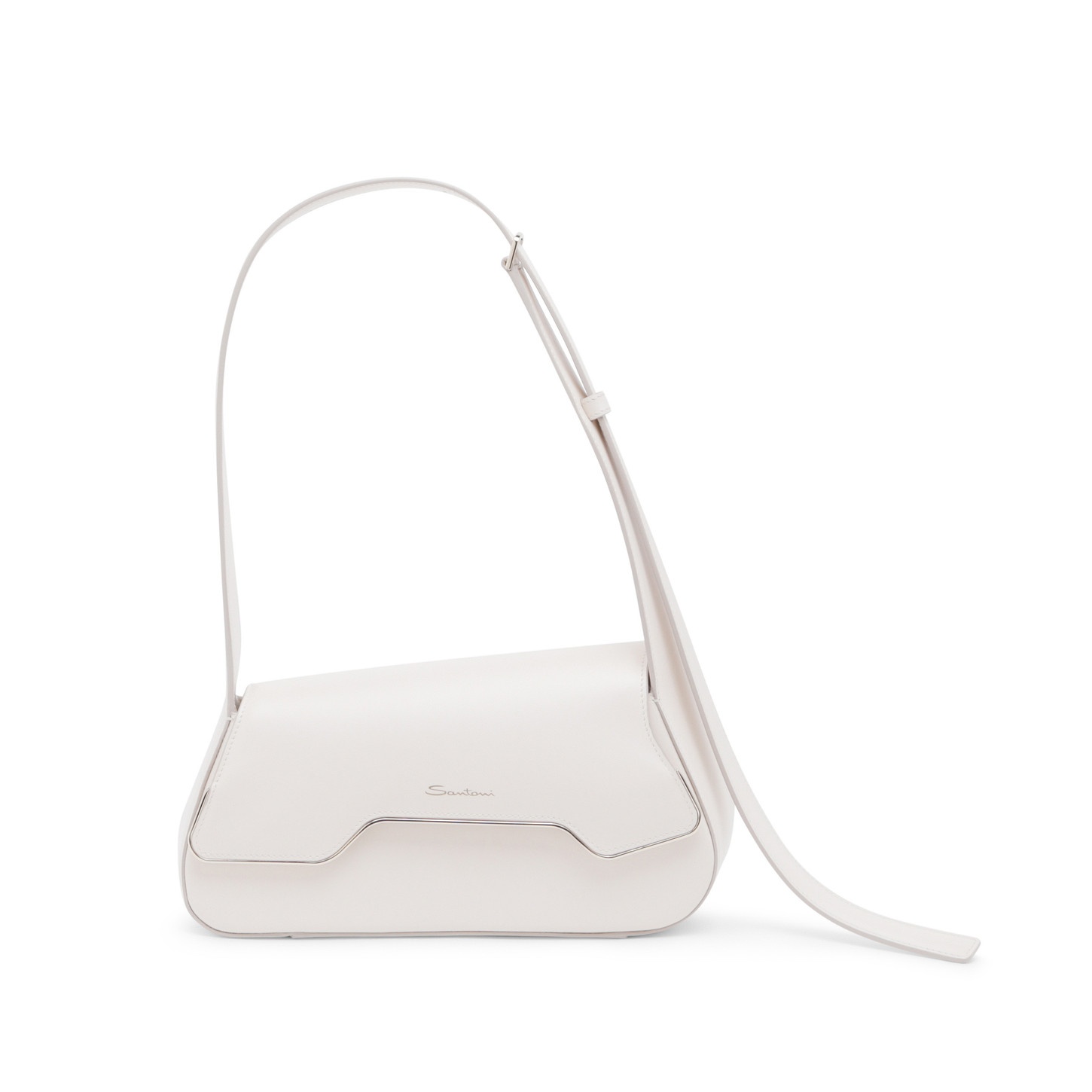 This Santoni bag channels an audacious, glamorous attitude. Its subtle asymmetric proportions exude a graphic energy, elevated with a geometric flap inspired by our iconic double-buckle shoe. Crafted from premium-quality leather, it fastens with a snap button and is finished with an adjustable shoulder strap for maximum versatility. Product details Product ID: DFBBA2411BAHAUBI40 - Women’s shoulder bag - Crafted from leather - Color: white - Double-buckle-inspired flap closure - Adjustable strap - Printed Santoni logo - Made in Italy