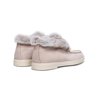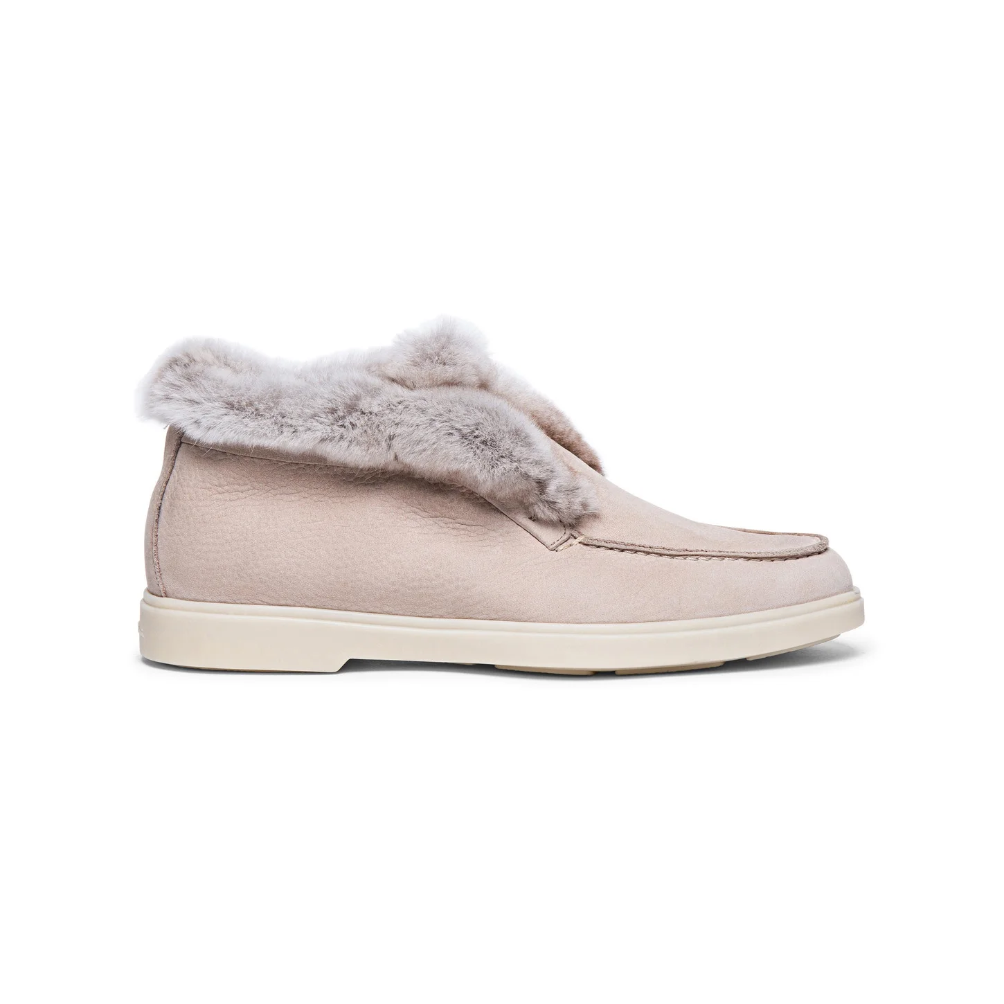 A classic off-duty look, updated with Santoni’s artisanal luxury. This women’s desert boot is crafted from elegantly textured tumbled nubuck, elevated with fur trims for a luxurious feel during the colder months. Its round-toe silhouette is accentuated with raised apron stitching, supported by a smooth rubber sole for a modern touch. Product details Product ID: WUYA59712TISANTVP43 - Women's desert boot - Crafted from tumbled leather and fur - Colour: pink - Round toe - Hand-stitched apron - Lapin trims - Fur lining - Smooth rubber sole - Printed Santoni logo on the insole - Made in Italy