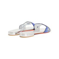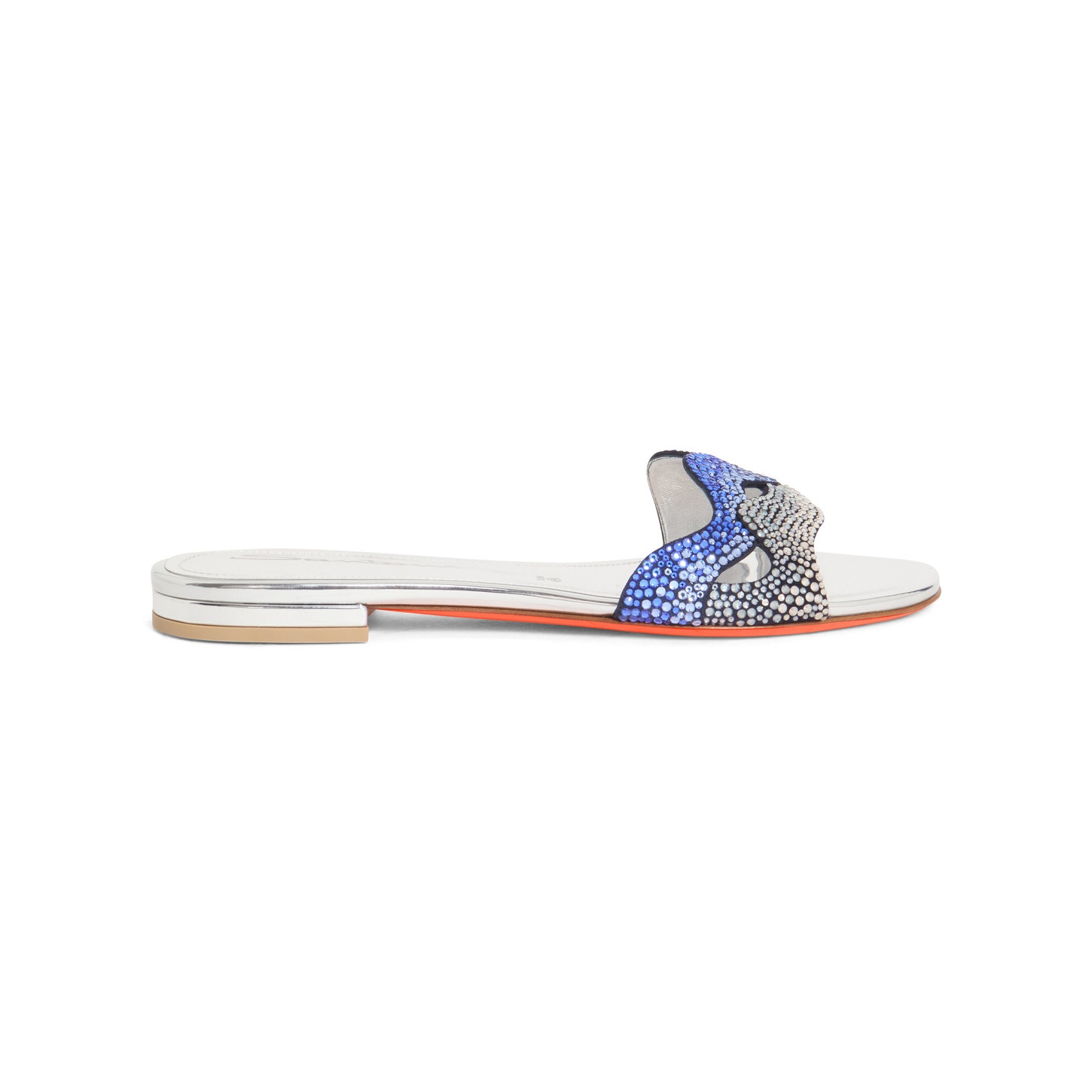 Elegant details and morning-to-night comfort: this flat sandal brings glitz and glamour to your summer rotation. Its metallic leather design is encrusted with glistening crystals, embracing the foot with sophisticated wavy bands. Its contrast leather sole stands out with the radiant allure of our signature Arancio Santoni. Product details Product ID: WHOA71659HD1TOXNU40 - Crafted from crystal-encrusted metallic leather - Color: silver and blue - Round toe - Front band - Leather sole - Printed Santoni logo on the insole - Made in Le Marche, Italy