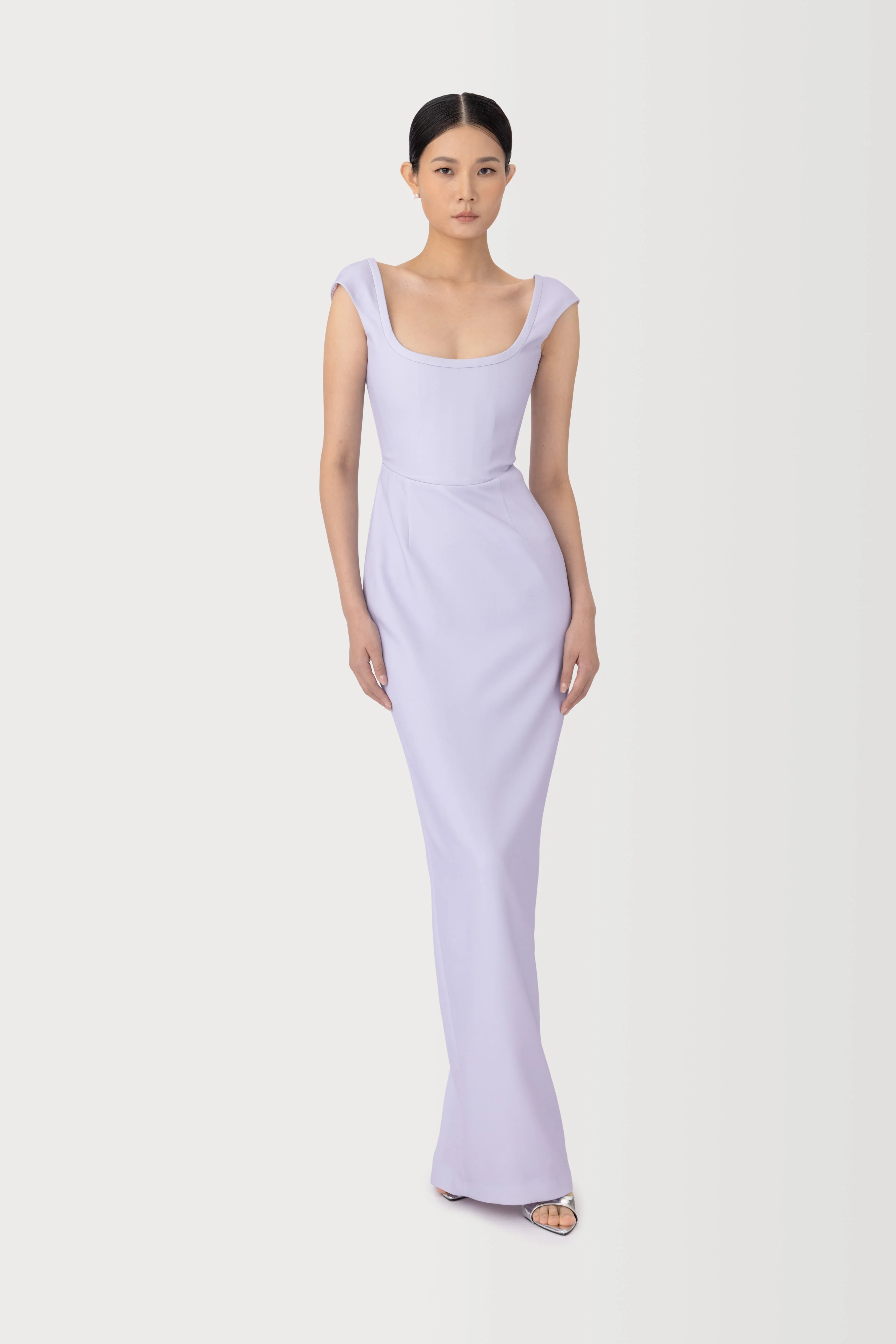 The Brooke gown is a floor-length design in smooth crepe fabric. It features a scoop neckline and a built-in structured corset for a sculpted fit. A front curved waistline defines the silhouette, while a back slit completes the sophisticated look. SIZE & FIT • Fits true to size, take your normal size • Fully Lined • Non-stretch fabric • Model's measurements: height 5'9" bust 32 waist 25 hips 35 • Model is wearing size 2 MATERIAL & CARE • Shell - 100% Polyester • Lining - 97% Polyester, 3% Spandex • Garment Care: Hand wash separately or dry clean