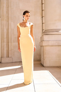 Crepe fitted gown with a scoop neckline and slight cap sleeves SIZE & FIT • Fits true to size, take your normal size • Designed for a closed fit • Fully lined • Fully boned corset top • Non-stretch fabric • Length (shoulder to hem): size 00 to size 0 - 51.4", size 2 to size 14 - 53.3" • Model's measurements: height 5'9" bust 32" waist 25" hips 35" • Model is wearing size 2 MATERIAL & CARE • Shell - 100% Polyester • Lining - 97% Polyester, 3% Spandex • Garment Care: Hand wash separately or dry clean