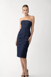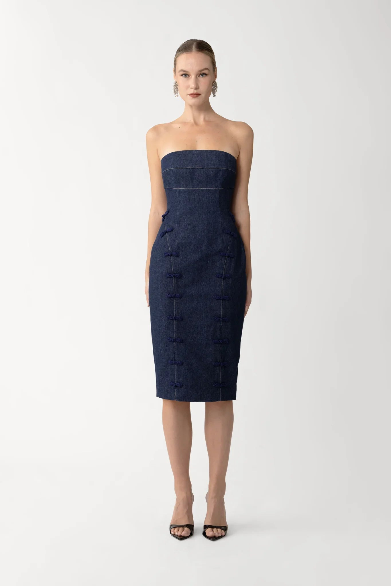 The Brooklyn Dress is a strapless, fitted denim midi style with a fully boned corset bodice. Featuring hand-tied pipa knots that trace the front from the waist down, it’s a signature silhouette with sculpted support. SIZE & FIT • Fits true to size, take your normal size • Fully lined • Length (bust to hem): size 00 to size 0 - 40.3", size 2 - 41.1", size 4 - 41.5", size 6 - 41.9", size 8 to size 14 - 42.2" • Model's measurements: height 5'9" bust 32.5" waist 23.5" hips 35" • Model is wearing size 2 MATERIAL & CARE • Shell - 100% Cotton • Lining - 100% Polyester • Garment Care: Hand wash separately or dry clean