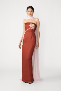 The Cherrie Gown is a modern classic column silhouette that makes a statement with its asymmetrical chrysanthemum applique over a fully boned bodice. MATERIAL & CARE • Shell - 100% Polyester • Lining - 97% Polyester, 3% Spandex • Garment Care: Hand wash separately or dry clean