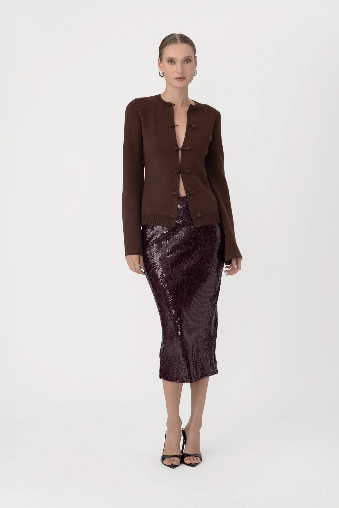 The Clover Cardigan is a fitted knit with a flattering silhouette and signature hand-tied pipa knot to elevate your everday look or style with a special occasion skirt. MATERIAL & CARE • Shell - 70% Viscose, 30% Polyester • Unlined • Garment Care: Hand wash separately or dry clean