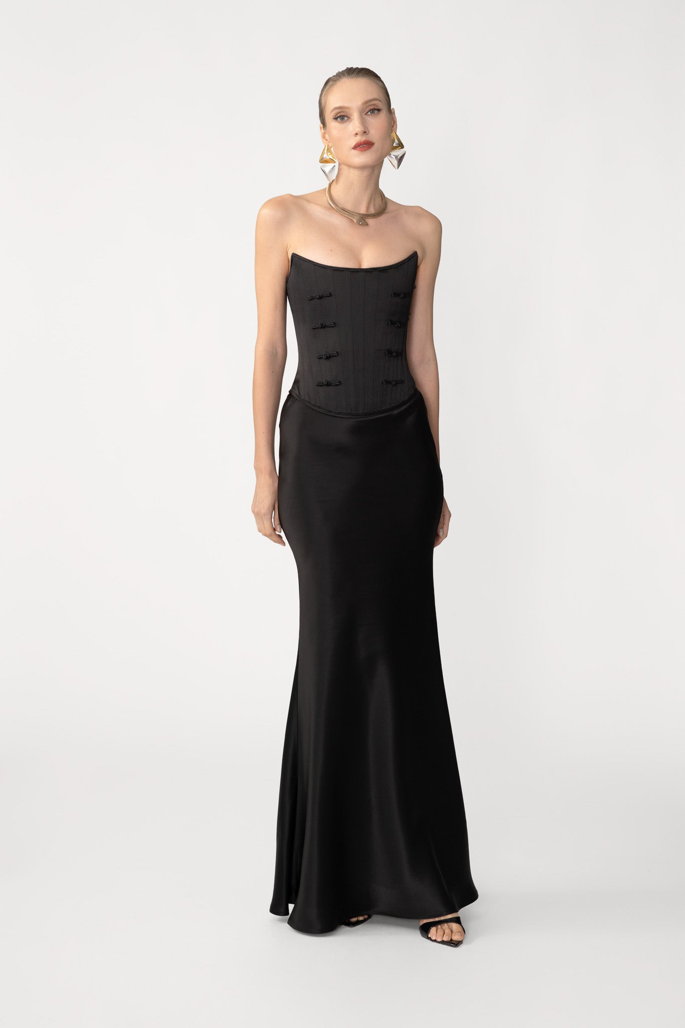 The Della Skirt is a satin maxi cut on the bias for a fluid drape that elongates the frame. An elevated and versatile piece, perfect for special occasions or everyday styling. Pair it with the Della satin corset top for a sensual statement look. MATERIAL & CARE • Shell - 75% Acetate. 25% Polyester • Unlined • Garment Care: Hand wash separately or dry clean