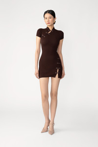 The Denali Dress is a modern fitted mini knit cheongsam with a mandarin collar, capped shoulders, and a classic slit at the collar and opposite thigh with signature pipa knots. A comfortable and effortless look that can be styled to transition from day to evening. MATERIAL & CARE • Shell - 100% Viscose • Unlined • Garment Care: Hand wash separately or dry clean