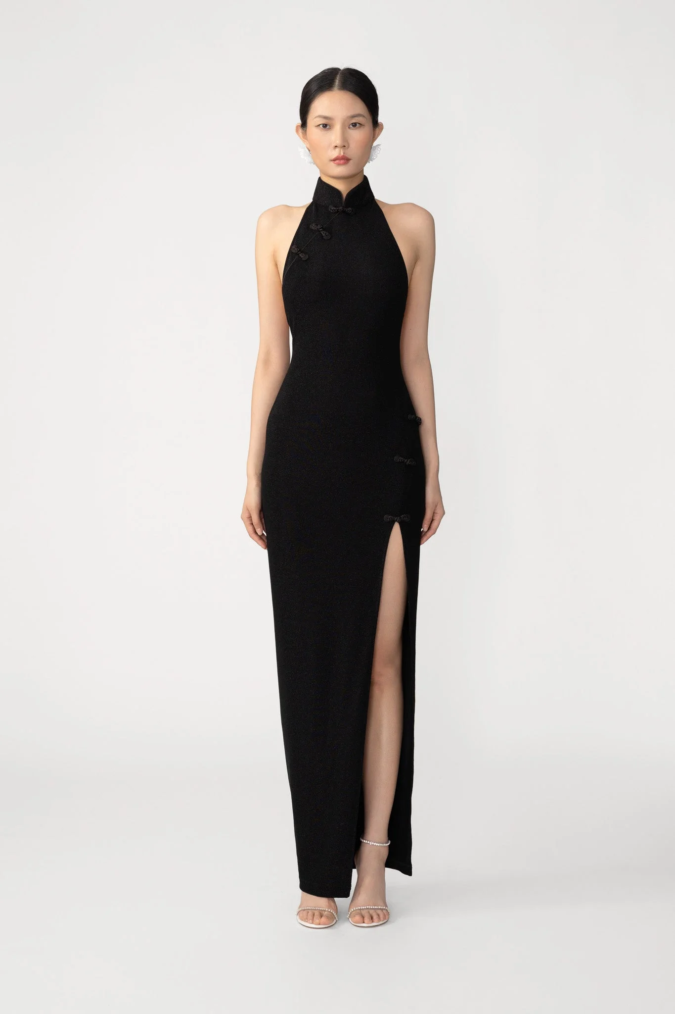 The Desiree Dress is a shimmering modern knit cheongsam with a mandarin collar, halter neckline, and thigh-high slit featuring signature pipa knot detail. MATERIAL & CARE • Shell - 57% Nylon, 39% Metallic, 4% Spandex • Lining - 94% Polyester, 6% Spandex • Garment Care: Hand wash separately or dry clean