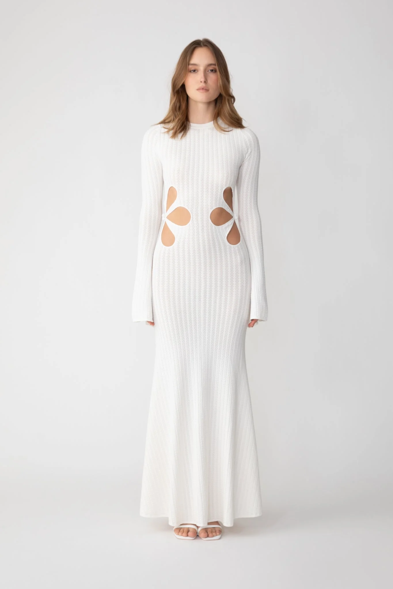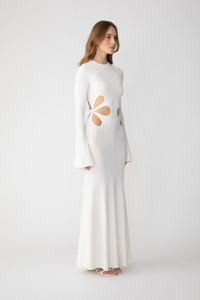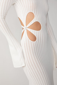 Destiny is a full-length soft crochet knitted dress that hugs at the hips and then gently flares into a maxi hem. Light-weight, comfortable, only subtly sheer, this statement look features our signature laser-cut flower motif with bell sleeves. The perfect summer piece over over a bikini or dressing effortlessly chic day to evening. SIZE & FIT • Fits true to size, take your normal size • Designed for a close fit • Unlined • Stretch fabric • Laser cut flower on waist • Flare sleeves • Length (shoulder to hem): size 00 to size 0 - 56.7", size 2 to size 14 - 58.7" • Model's measurements: height 5'9" bust 31.5" waist 23" hips 35" • Model is wearing size 2 • Bump friendly - select one size up from your usual size MATERIAL & CARE • Shell - 100% Viscose • Garment Care: Hand wash separately or dry clean