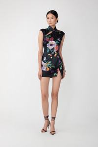 Modern Cheongsam mini dress cut from printed satin featuring Mandarin collar with cut-out detail, shoulder caps, and small thigh slit. SIZE & FIT • Fits true to size, take your normal size • Fully lined • Non-stretch fabric • Mandarin collar • Keyhole cut-out at shoulder • Mini slit at the hem • Length (shoulder to hem): size 00 - 31.3", size 0 - 31.3", size 2 - 32.1", size 4 - 32.9", size 6 - 33.7", size 8 to size 14 - 34.4" • Model's measurements: height 5'10" bust 32" waist 23.5" hips 34.5" • Model is wearing size 0 MATERIAL & CARE • Shell - 72% Acetate, 28% Polyester • Lining - 97% Polyester, 3% Spandex • Garment Care: Hand wash separately or dry clean