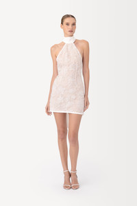Featuring a scarf-draped satin halter neck and an alluring open back, the Donna lace is crafted from silver-beaded lace with a soft chiffon lining in a mini length.